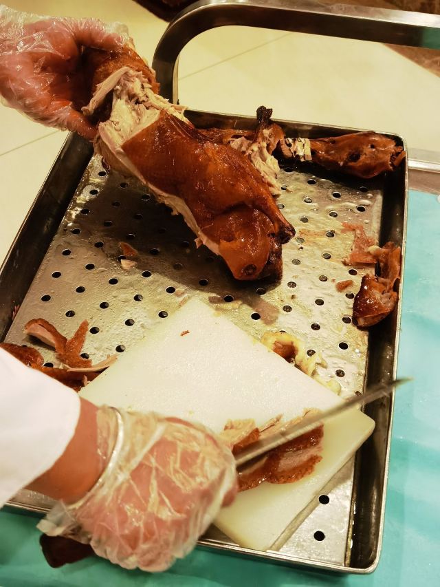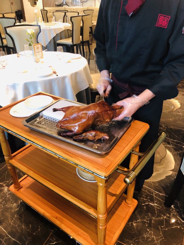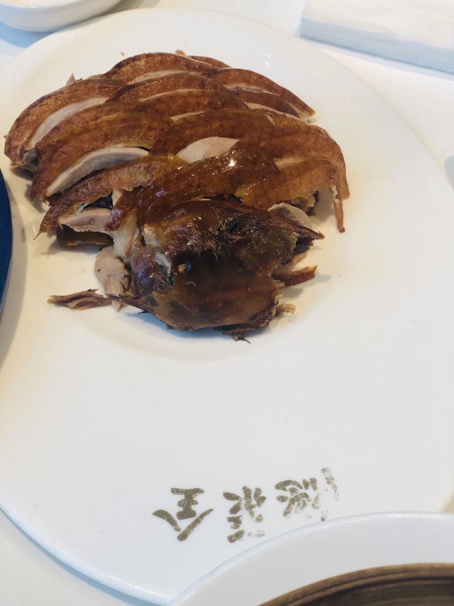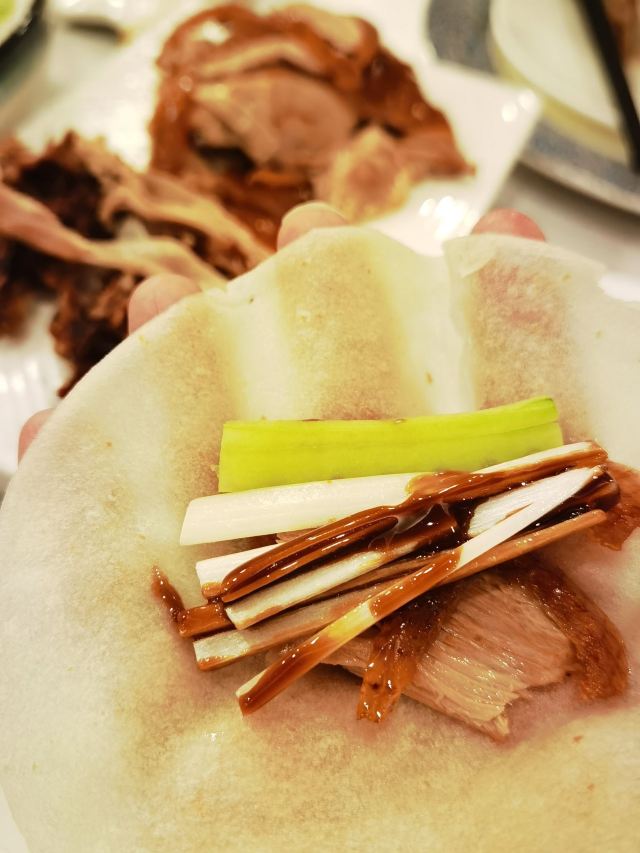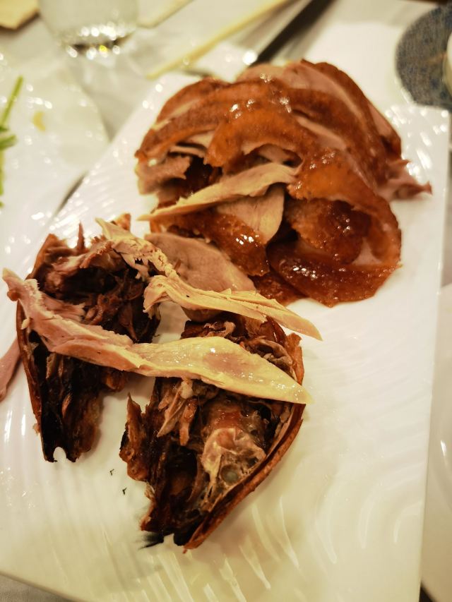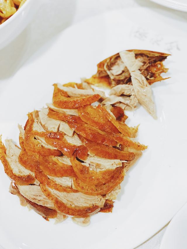 Quanjude Roast Duck (PuDong)年前和小伙伴们的聚餐,选在了全聚德。在国信紫金大酒店的三楼,面积超大,都坐满了,人气超旺。 「全聚德烤鸭」 北京老字号,全聚德烤鸭是必点。四个人点了半只就差不多了,师傅在桌前现片,刀工又快又好,用荷叶饼裹上葱酱、黄瓜条、鸭皮、鸭肉,香脆但不腻,超好吃,不愧是老字号。 「宫廷豌豆黄」 豌豆黄做成了小鸭子的造型,可可爱爱,都舍不得下口,软糯可口,是不错的饭后点心。