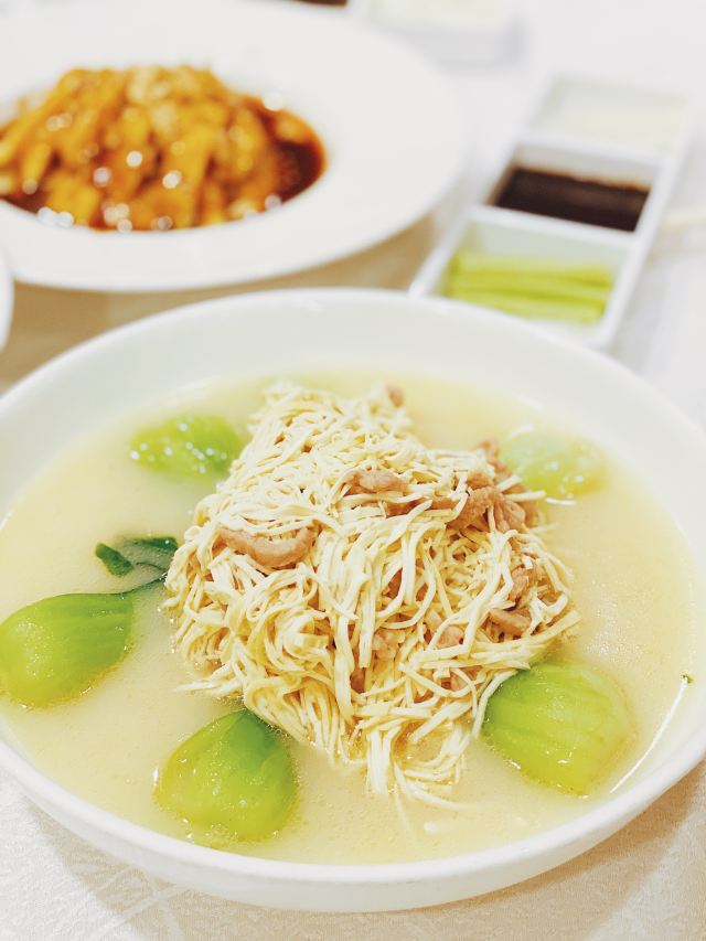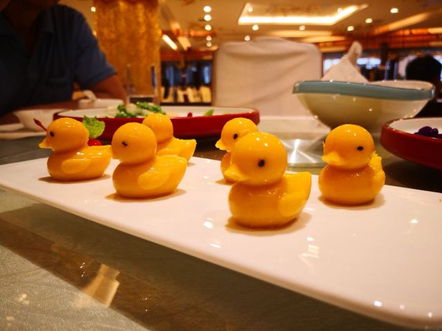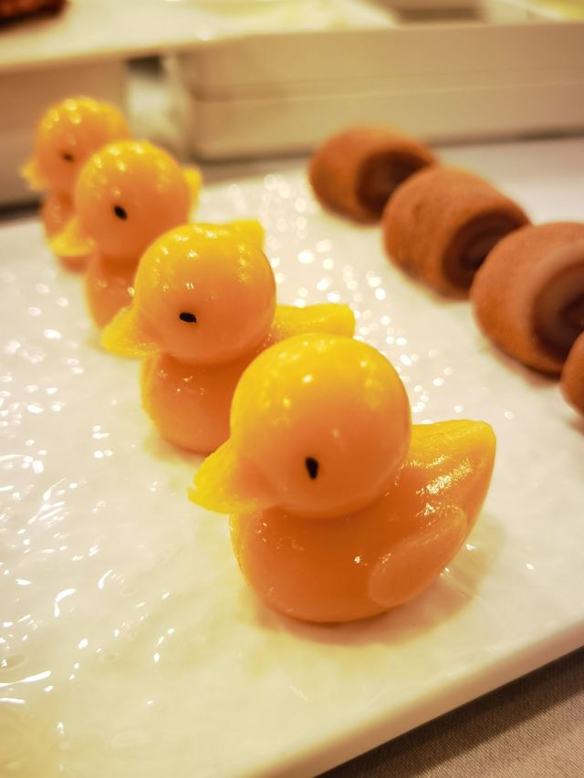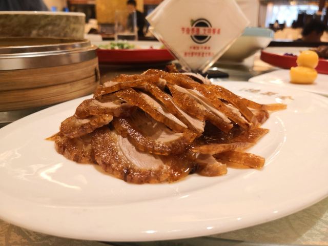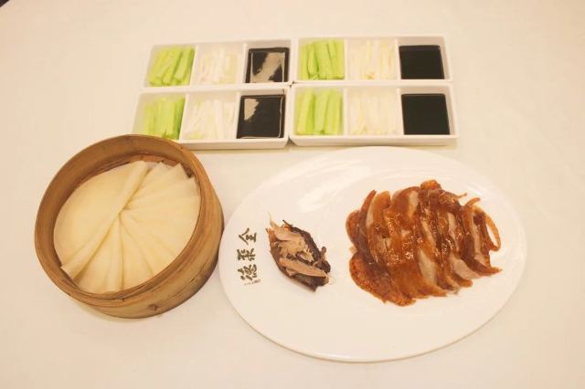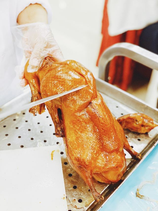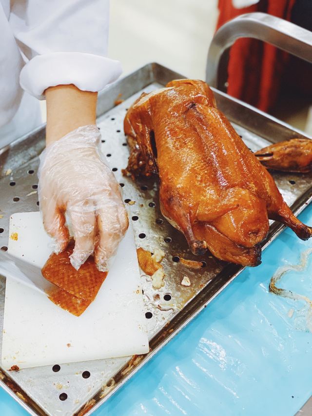 Quanjude Roast Duck (PuDong)年前和小伙伴们的聚餐,选在了全聚德。在国信紫金大酒店的三楼,面积超大,都坐满了,人气超旺。 「全聚德烤鸭」 北京老字号,全聚德烤鸭是必点。四个人点了半只就差不多了,师傅在桌前现片,刀工又快又好,用荷叶饼裹上葱酱、黄瓜条、鸭皮、鸭肉,香脆但不腻,超好吃,不愧是老字号。 「宫廷豌豆黄」 豌豆黄做成了小鸭子的造型,可可爱爱,都舍不得下口,软糯可口,是不错的饭后点心。
