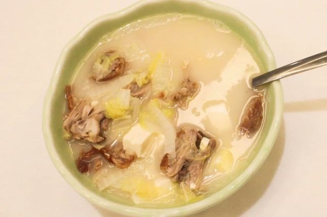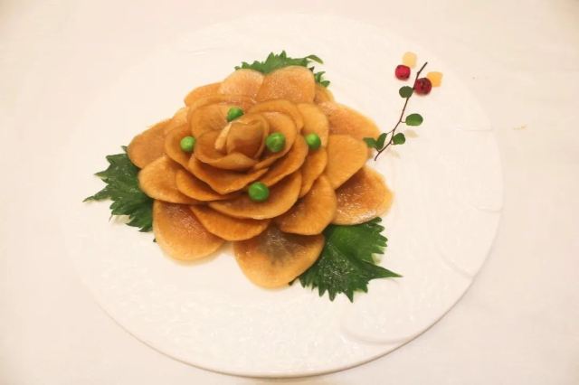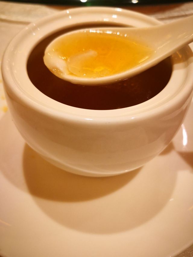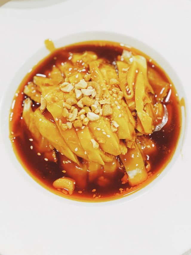 ma****ly家庭聚餐,想到好久没吃过烤鸭了,于是来到了全聚德。 点了份原价498元的2—4人套餐,包括半只烤鸭,两个热菜,一份双拼的冷菜,一道蔬菜,两位汤,一份点心,最后还有一个果盆。 冷盆是无骨鸭掌和酱萝卜的组合,鸭掌配了芥末芝麻酱,只是芥末的味道盖住了麻酱的香,当嚼着感觉那冲鼻的味道,觉得还不如给碟酱油呢。倒是那酱萝卜,脆嫩酱香,汁水葱郁。 烤鸭来的时候,店员会提醒的。半只烤鸭是不包括鸭架的,所以我打算用鸭架做一份泡饭的计划落空了,不过点烤鸭会送一份鸭架冬瓜汤,稍稍弥补了。 汤是鸭舌乌鱼蛋汤,套餐里只有两位,我们价钱加了一份,可是我捞了半天,也没“打捞”起鸭舌,至于汤的味道,就像是一碗勾了芡的胡椒粉汤,真心不建议点。 豌豆黄做成了一只只小黄鸭的样子,很少可爱。