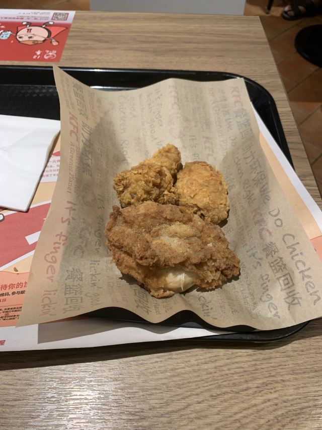 寂寞的西瓜🐯🐯新年已经近在眼前,各种应景的中国元素也是越来越多。一早路过Ta家,就有了惊喜🆕发现! 📍 名称:「肯德基·洛川店」 店铺地址:洛川东路221号 营业时间:06:00-22:00 🌳 环境: 这家K记应该可以被算在大宁商圈内,却远离各种商业中心,貌似已经独自开在居民社区好多年惹,所以硬件设施虽然翻新过多次,却依然还是周边爷爷奶奶们zui爱孵空调的首选圣地🤣🤣 🍗 口味: 「素菜包」 wuli大魔都老牌素菜馆春风松月楼 & K记的联名新款早餐,被改良成了mini size的小个子,轻松恰无负担。 蔬菜馅里还额外添加了油面筋、香干,口感层次够丰富。 菜包➕粥,西式快餐店里的标准中式早餐配置😋 「肯德基热干面」 又是一款中式经典,口味比起正版热干面本面,肯定还是有差异哒,胜在好玩又方便嗦~ 「植物肉汉堡」 绿色包装外盒的植造肉肉系列,有汉堡,有鸡块,口感意外地还不戳,偶尔尝试🉑️ 用超满足的中式早餐,期待新年倒计时!