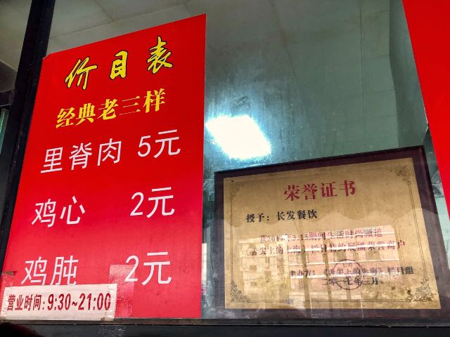 蓓家温暖最近咖啡节活动让我迷上了 City walk,一路走走看看来到了延安西路,看着路边一家卖里脊肉的摊位我告诉同行的小美女,这家不正宗,论好吃且带着童年记忆味道的里脊肉我只认长发餐饮,没有其他! 环境:位于延安西路955号的长发餐饮是一家不算起眼的小店,然而只要在营业时间里,长发的门口总是会有不少人有序排着队,他们都是冲着“经典老三样”来的。只要看着前面排着长队,那你就找对地方了。 服务:以前一直是老板和老板娘在打理店铺,现在主理是老板娘的儿子,子承父业,小时候的口味得以延续,排到窗口前报上需要的数量和口味,再自行扫码付钱,等着窗口递来冒着热气的竹签托着纸杯,一番操作行云流水,店家省心,买家放心。 【招牌里脊肉】从2012年就开始吃长发家的里脊肉,一块块肉质饱满、扎实串在长竹签上,拿在手里颇有分量感,刚出锅就要趁热吃,飘着肉香,一口下去鲜美多汁,每块及其入味。 【美味鸡心】大鸡心四只一串,鲜嫩入味也爆汁的。 【美味鸡胗】喜欢有嚼劲脆脆口感的肯定爱吃鸡胗的。 我就是冲着“经典老三样”来的,里脊肉、鸡心、鸡胗每样都吃了获得的是大大的满足感,更是童年记忆里经典美食和现实吻合了,老三样随着食材和时代的变化涨价了,但带来的情绪价值却是无价的。