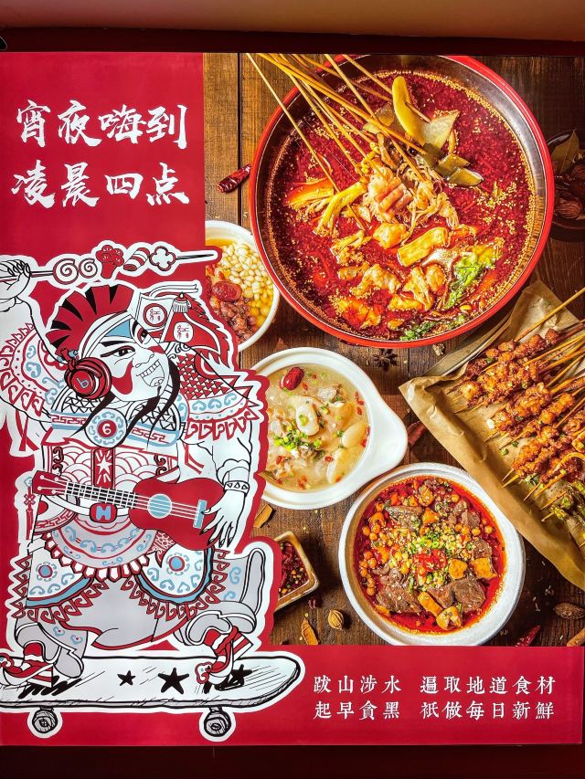 土豆,年糕,小馒头,空运鲜黄喉,牛蛙,掌中宝,羊肉串,藕片,椒麻锅底,酸辣粉,峨眉派烤串,口水猪蹄,烤鸡中翅,老妈蹄花,特色烧烤,三鲜冰粉,冒脑花,烤猪脑,鸭血,金针菇,串串香麻辣烫,山里包浆豆腐,山城六宝冰汤圆