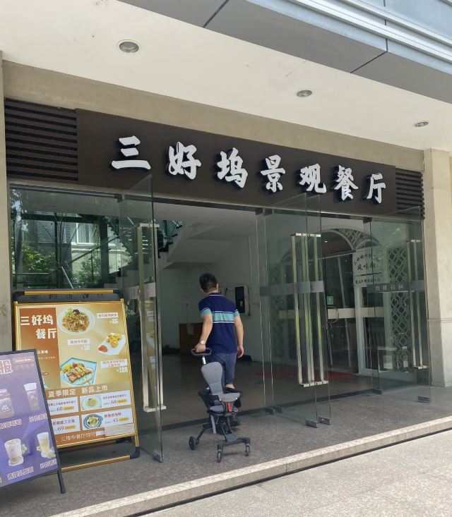 SanHao Wu JingGuan Restaurant1)店面位置: 位于同济大学四平路校区内(近彰武路)国际学生宿舍楼楼下。 2)餐厅特色: 靠窗景观沙发座位可以看到校园内的亭台楼阁、小桥流水、绿荫。 3)餐饮体验: 餐厅有透明观光电梯,也有设计感十足的弯曲爬行楼梯 一楼是清真餐厅,需要刷校内饭卡,人比较多,但价格实惠; 二楼是西餐厅和星巴克,提供意面、牛排、披萨等简餐。 三楼是中餐厅,主要是本帮江浙菜,有包房和大厅。 支持扫码点单。点单后出单速度尚可 西餐厅的芝士培根焗弯筒面配有罗宋汤,面奶香满满,培根也比较多; 香烤青花鱼里有薯条、生菜、煎蛋等配菜和蘸料 法式南瓜汤南瓜味道比较浓郁; 水果披萨趁热吃比较香甜。 适合学生自选和校园访客,价格相对实惠。