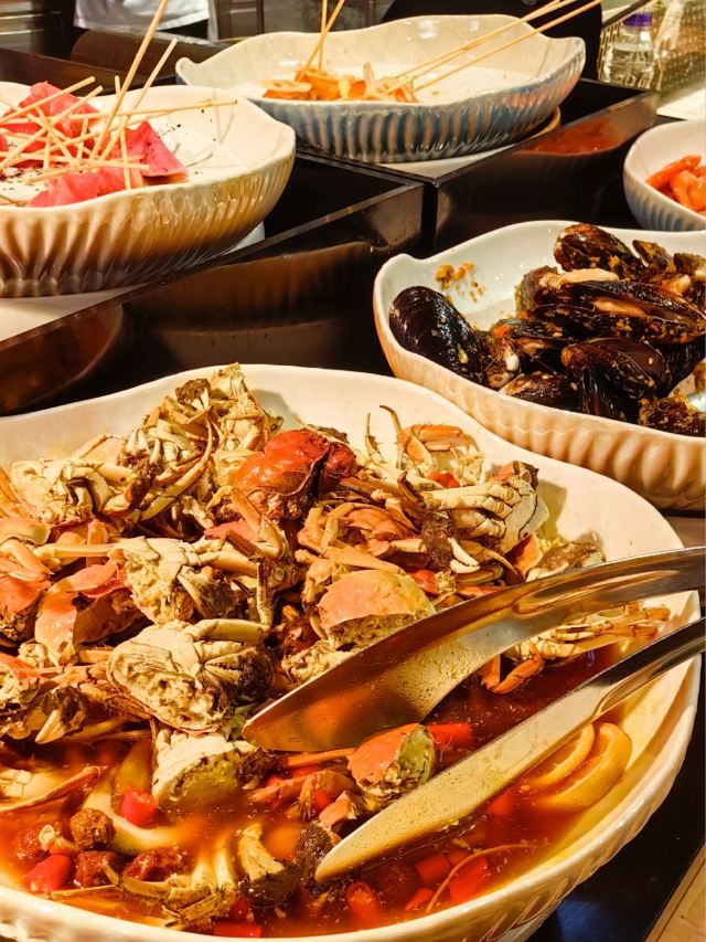 D了个Y最近被朋友安利一家自助餐厅 说是很火很难约 讲真 对自助餐我其实兴趣一般的 一来实在是胃口有限 二来自助餐的感觉就是人多嘈杂 样样有但未必好 不过当听闻是香格里拉旗下嘉里酒店里的自助餐时 我觉得还是可以去试试 毕竟香格里拉的餐饮 向来都是不错的 更难得的是他家有个“疯狂星期一”活动 就性价比真的相当高了 餐厅位于嘉里酒店一层 环境自然是极好的 正是赶上周一去的 里面坐的满满当当 虽然已经有预约 但还是不得不拼桌 餐饮的品类相当丰富 如果胃口够好 当然可以每样都尝一尝但是像我这种胃口一般的 除了自己喜欢的 还得考虑一下性价比 比如限定供应的佛跳墙 比如新鲜上市的梭子蟹 比如无限供应的三文鱼 等等等等 这里不但餐饮丰富 口味也是不错的哦 而且补餐相当及时 值得推荐