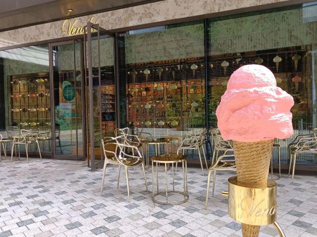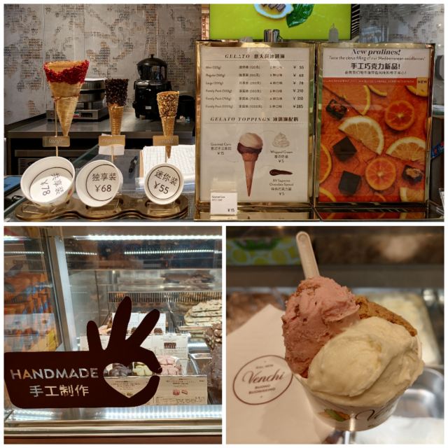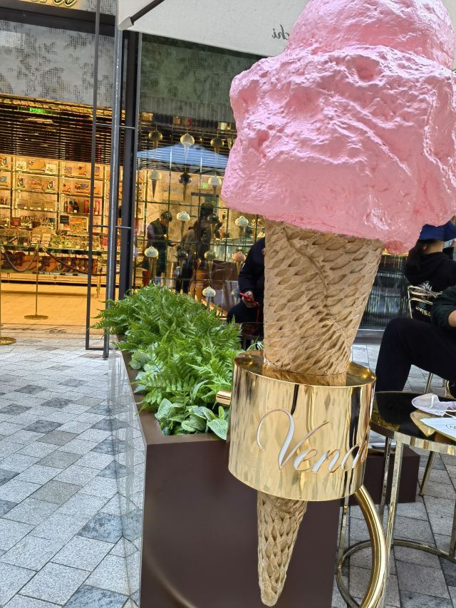 旅の径Venchi闻绮,在上海有8家门店,前滩太古里店开在1层(POP MART隔壁)。 Venchi,源自1878年的意大利巧克力顶级品牌,有"巧克力的爱马仕"美誉。 冰激凌是Venchi的兼营产品,中国大陆的门店中,冰激凌的销售量高于巧克力,可谓是歪打正着。 逛逛前滩太古里,被Venchi闻绮门前的巨型草莓蛋筒冰激凌和临街橱窗一排排缤纷的蛋筒冰激凌吸引,进得店堂。 左边是巧克力展示区+品尝休息区,右边为冰激凌展示区+销售区。 两墙一桌的巧克力+满柜的冰激凌琳琅满目、鲜艳迷人,侃侃而谈的店员小姐姐细心介绍、热情动人,湖绿色的沙发餐椅洋派典雅、清新可人~欧风十足。 点了68元的3球(菠萝椰子+卡布基诺+草莓巧克力脆片),价格和口味均高于哈根,真的好好吃。 推荐:菠萝椰子,菠萝的酸甜+椰子的清香+奶油的浓郁,混合成独特的口味、细腻的口感,一级棒! 小贴士:前滩太古里,位于东育路500号。地铁6号线、8号线、11号线东方体育中心地铁站3号出口,直达B1层。