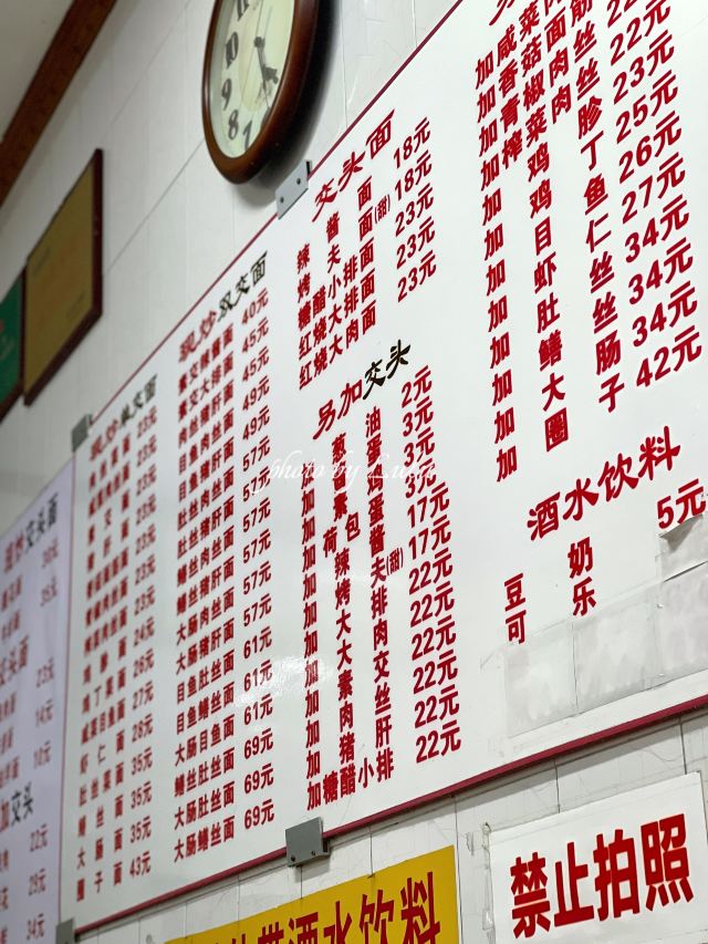 大肠面,肥肠猪肝面,肉丝菜面,鳝丝肉丝面,素鸡,素交辣酱面,大肠鳝丝面,香菇面筋鳝丝面,鸡肫面,咸菜目鱼面,大肠猪肝面,素交面,圈子面,青椒肉丝面,香菇面筋面,牛肉面,鳝丝目鱼双浇头面,虾仁面,大排,鸡丁菜面,雪菜目鱼,浇头大肠