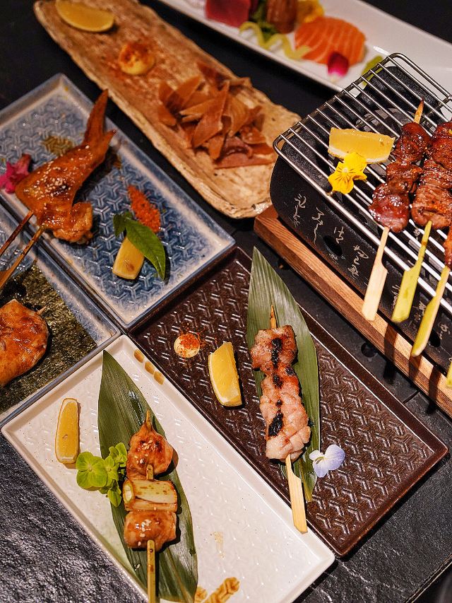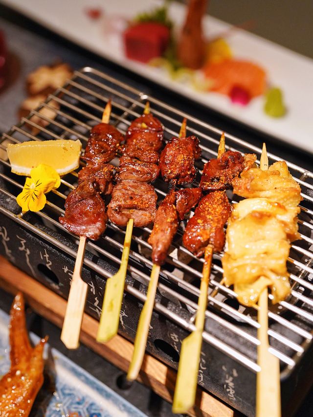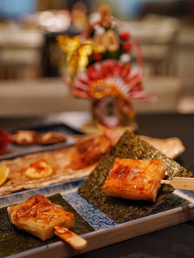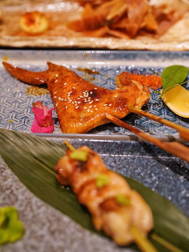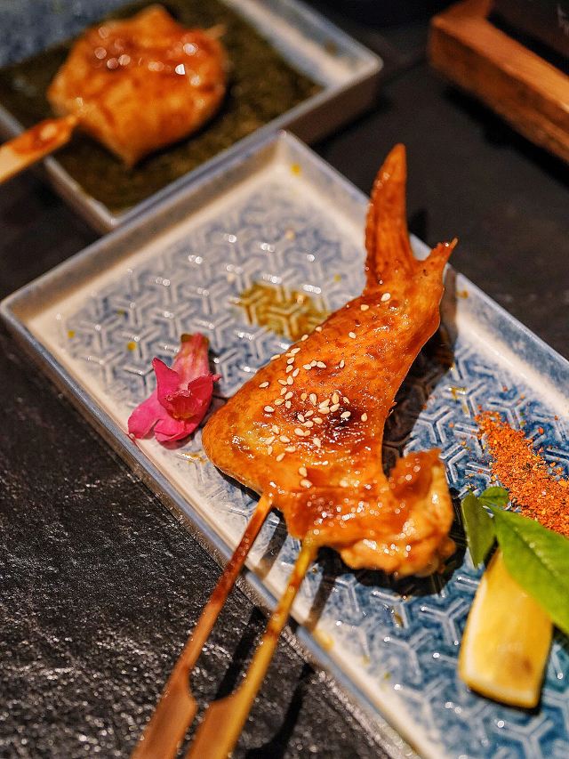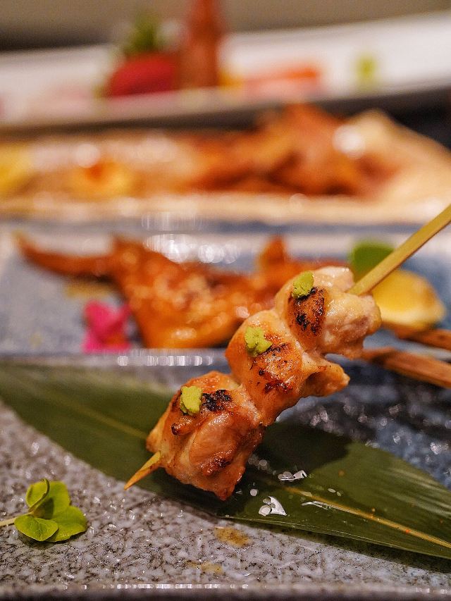 吃饭就别叫我了藏在五星级酒店里的高品质日料,如果我不告诉你,你未必发现得了🌝看到怡海推出¥398单人烤串套餐,我承认有点动心💓! 来这儿吃“鸡”是必须滴,鸡全家都被安排得明明白白。现点现烤的烧鸟,会根据食材的不同,分别搭配盐烧&酱烧,无论食材还是料理手法都是一流👍 ❤️鸡腿肉串❤️ 扒开金黄焦脆的鸡皮,饱满腿肉映入眼帘,看得出是用了最厚实的部位,咬开以后汁水饱满,还有恰到好处的山葵酱点缀,吃一口就能做出不得了的表情 🧡烤鸡皮🧡 鸡皮是烧鸟界的灵魂菜,立下flag不吃的人,都会被它油滋滋的酥脆口感所折服,鸡皮独有的脂香四散在口中,真滴绝👍 💛盐烤鸡中翅💛 入口间每一根骨头都可以轻松撕落,既保证皮脆肉嫩,剥下的骨头又不见血色,确实有点东西👏 💚日式烤年糕💚 糯叽叽们的挚爱!外脆里糯的烤年糕,记得一定要趁热吃,用海苔包裹一起送入口中,幸福指数瞬间飙升📈 另外还有刺身拼盘、烤鳐鱼干、金针菇牛肉卷,闭眼滚菜单,道道不踩雷☑️