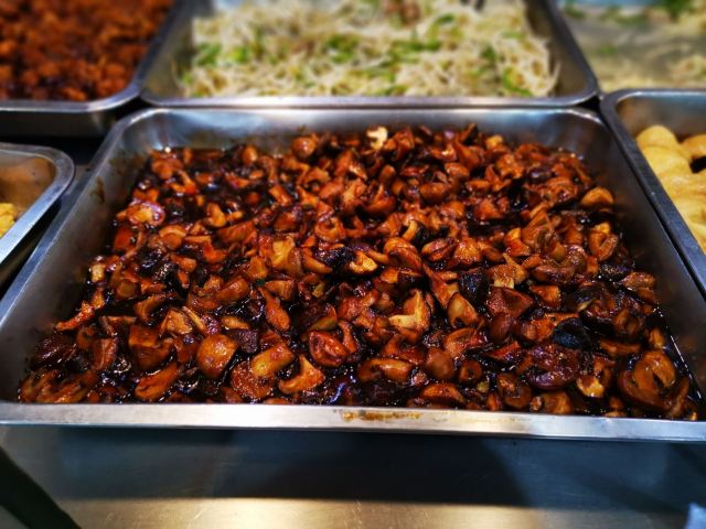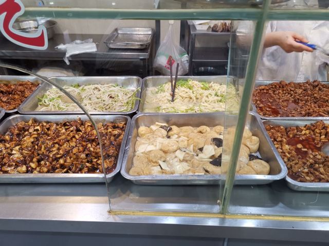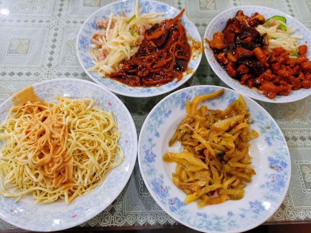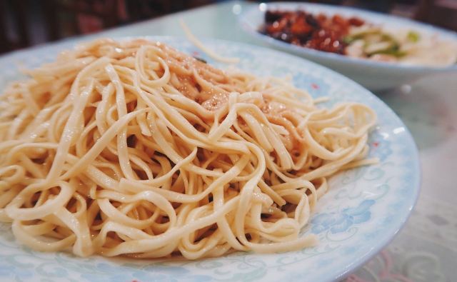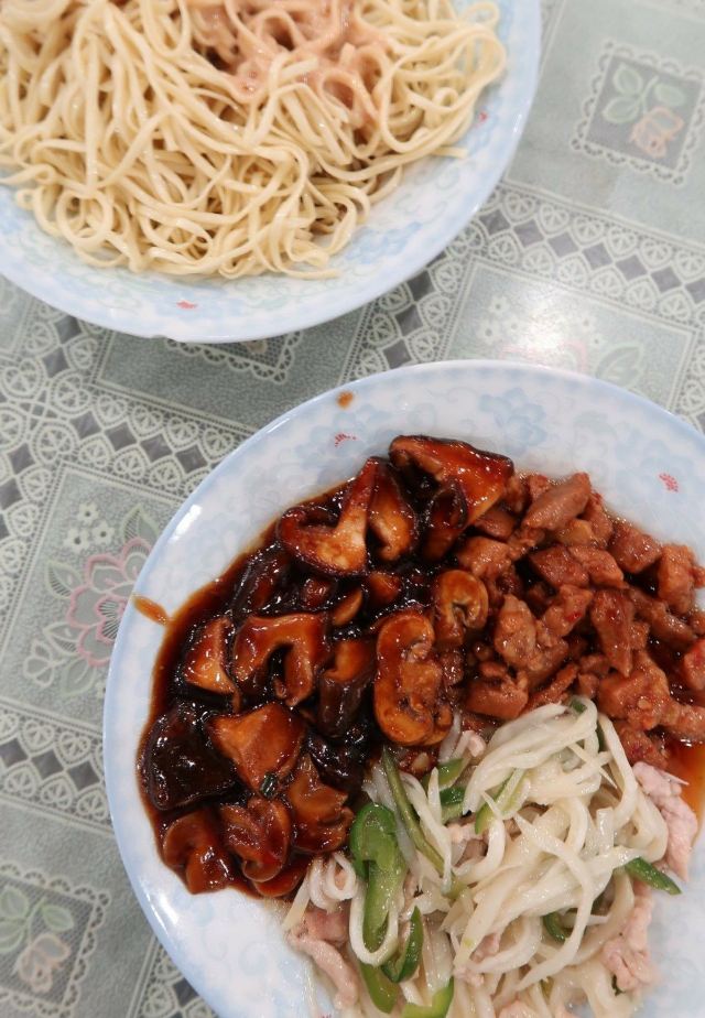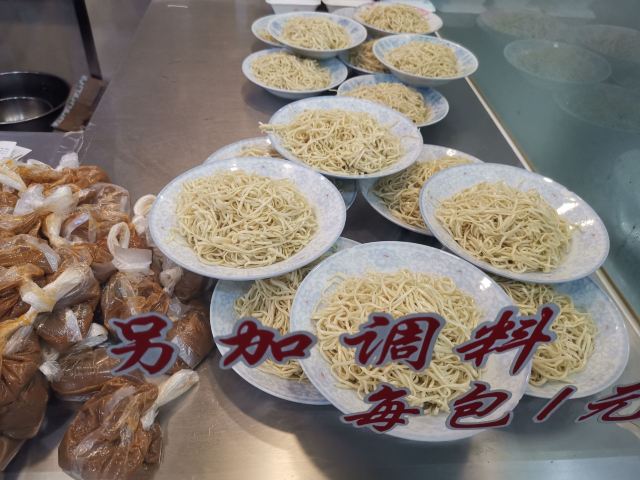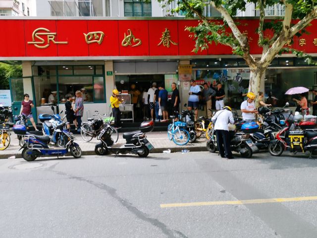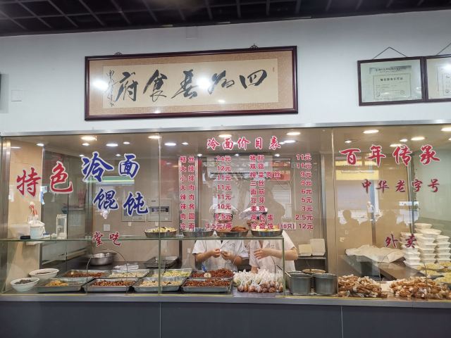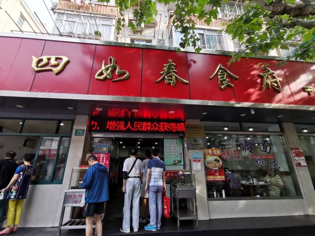 Si Ru Chun Shi Fu大热的天 小小的店 排队排到大门口 来吃的基本都是附近熟客 打包的 堂吃的 熟门熟路 大家都按既定的方向走 点单 付款 排队 拿面 有条不紊 秩序有序 冷面跟锅贴是绝活 早饭吃的晚了 就点一份小二两的冷面 这里的浇头不少 那就来五份都尝一尝 面是那种细细扁扁的 吹的很好 不僵不硬不结块 花生酱 醋 酱油是标配 一个都不能少 自己端来拌一拌 再拌一拌 爽滑自在 浇头做的很本帮 口味上总体都比较平和 不会很甜很咸或是很辣 配上一杯店里的冰镇绿豆汤 简直绝配 不过这环境嘛 哪儿哪儿都是人 排队的 等位的 感觉店里比室外都要高几度 有条件的还是建议打包或错峰