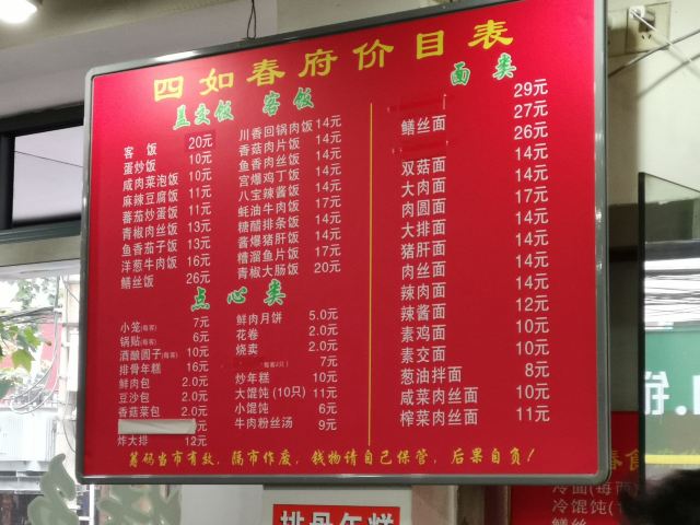 排骨年糕,酱爆猪肝饭,辣肉面,冷面,四如春大馄饨,牛肉粉丝汤,生煎,小馄饨,荠菜青团,辣酱面,鳝丝,咸蛋黄肉松青团,酱爆猪肝,椒盐排条,盖浇饭,葱油拌面,面筋,豆沙青团,炸猪排,锅贴,三丝,鲜肉月饼,冰镇绿豆汤,小笼,豆芽浇头,青团