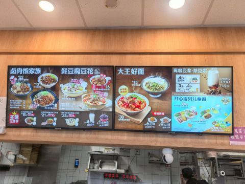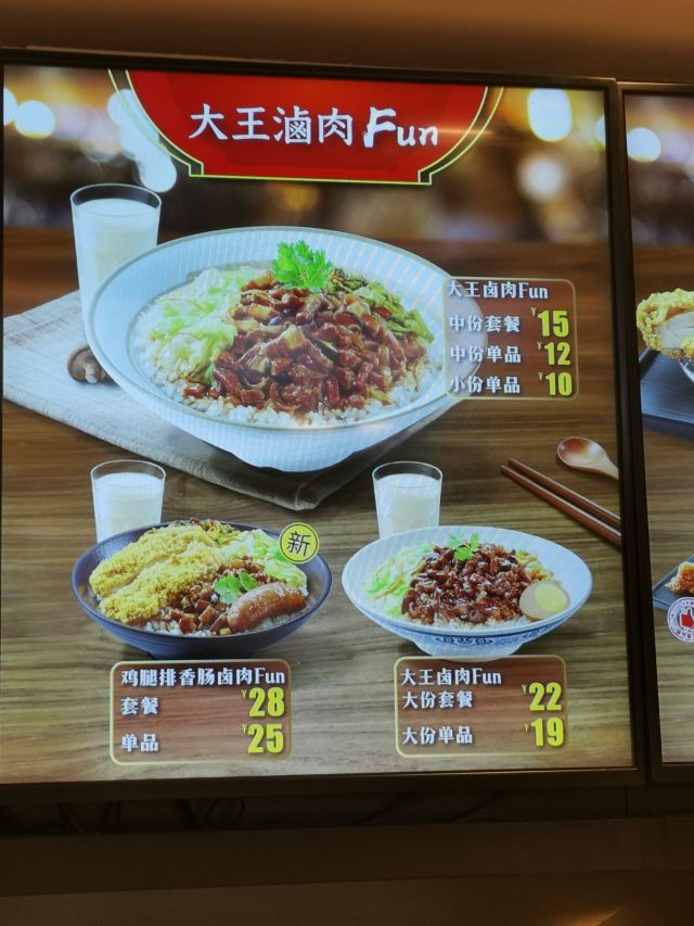 大王卤肉饭,早餐现磨豆浆,黑椒牛柳饭,早餐双色爆有料饭团,早餐全家福蛋饼,大王卤肉FUN,蒜香海带丝,早餐雪菜肉丝面,豆浆霜淇淋,清爽西兰花,卤肉浇头,脆香大鸡腿卤肉饭便当,鳗鱼卤肉饭,现磨豆浆,豆浆冰激淋,酥嫩鸡腿排卤肉FUN单人餐,早餐蛋饼油条,脆香大鸡腿,早餐非矾油条,新宫保鸡丁饭,早餐台式红烧牛肉面,脆香大鸡腿卤肉FUN