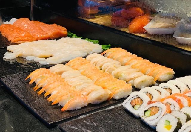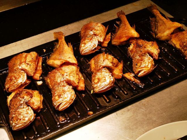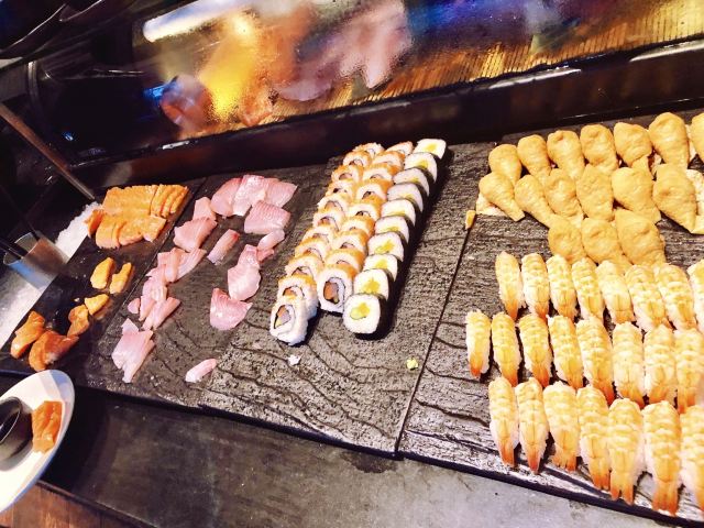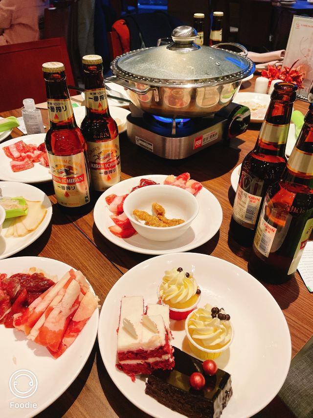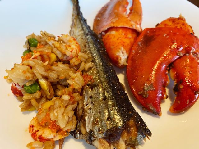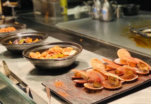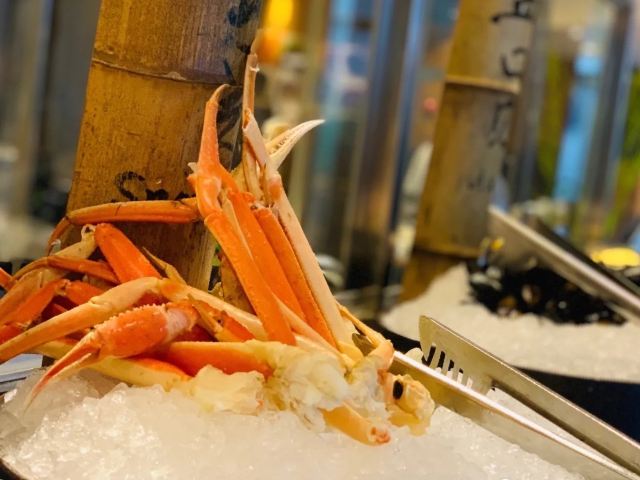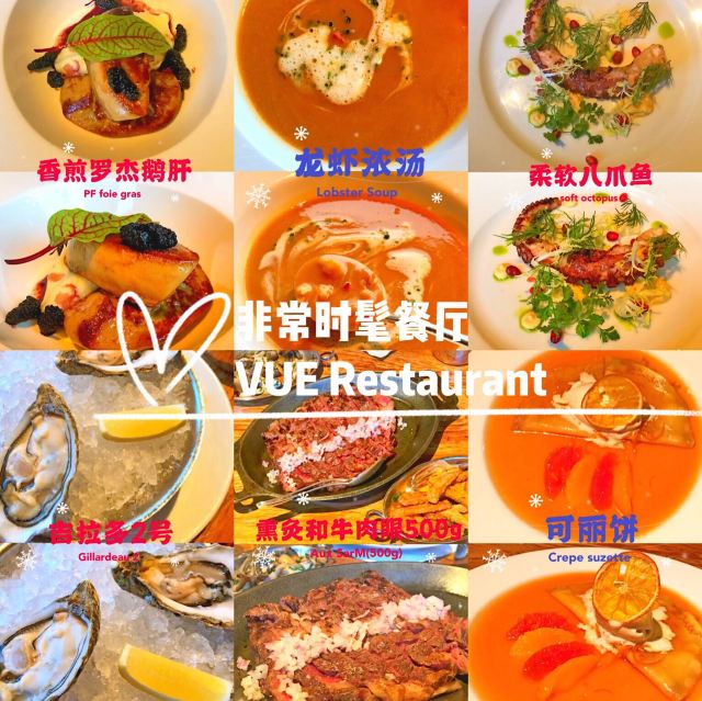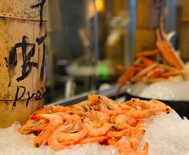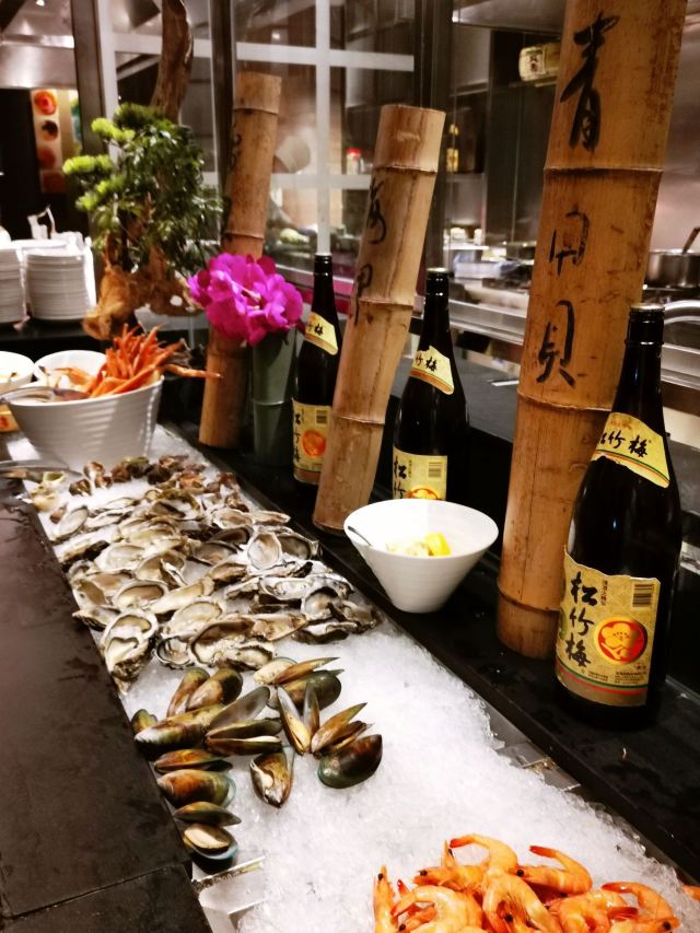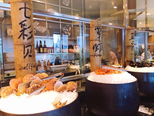 大闸蟹,黑蒜烤生蚝,龙虾,羊排,叉烧,提拉米苏,三文鱼刺身,冻花蟹,冻虾,天妇罗,咖啡,白葡萄酒,披萨,雪蟹脚,烤鸭,刺身,甜点,牛排,水果,冰淇淋