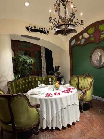 环境很有特色,在西班牙高迪风格的建筑里面,陈设比较怀旧和洛丽塔。菜品非常有特色,食材的滋味和感受处理的很好,初次吃不觉得,多品几次后,方觉大厨对火候和口味搭配的巧妙。水果的选择也和用心,非常新鲜,品质很好。排盘和器皿的选择也颇具匠心,值得多次体会。