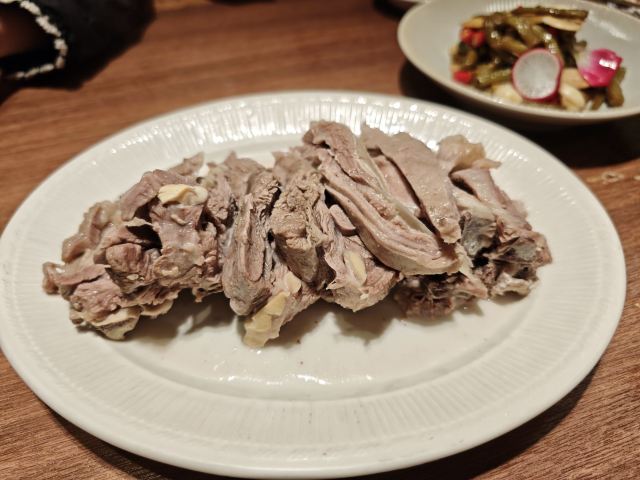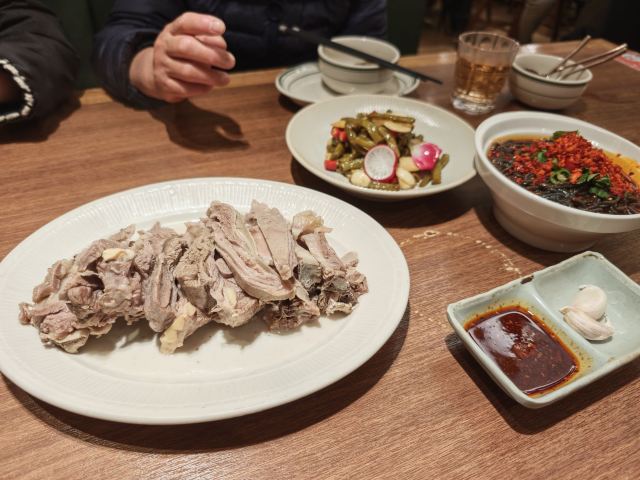 上海本地同事推荐,据说是从他小时候就一直火爆到今天的老店! 听着感觉有点玄乎,等到了店面真真的大吃一惊……排队整整排了一个小时!而且所有排队的人压根就没有离场换地儿的意思,真是夸张! 好不容易排到自己,进屋一看真是满满当当,点餐的时候还发现,吃烤肉的地方居然不售卖酒水,也算是奇葩了。 椒麻鸡:肉质软烂、味道极佳; 手抓羊排:单独吃羊肉的鲜嫩一览无余,搭配蘸料就又是另一种味蕾到享受; 羊蹄:看着没多少肉,啃起来倒是入味十足,这要有瓶啤酒,真的就太完美了… 主食选的新疆手抓饭,可能是配合上海的口味,放了葡萄干儿,略微的甜,身为北方人倒也不觉得反感。 整体感受,要是有瓶啤酒,我可以再上条羊腿!