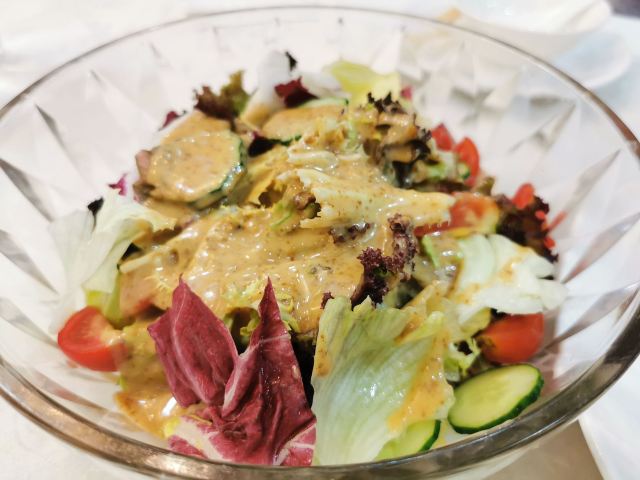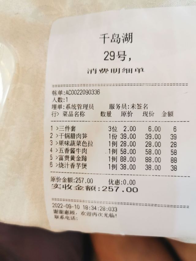 Qiandaohupingjiaxiao Seafood (tianlin)中秋节晚上的家庭聚餐,平时总经过柳州路,没太注意客流量,但是这天晚上基本上都满座还翻台面了。3个人点了2个冷菜和3个热菜。蔬菜色拉中规中矩;酱牛肉令人失望,感觉性价比很低;富贵黄金蹄是咸蹄髈,趁热吃不错,猪皮外脆里糯;香芋煲很入味,值得推荐;干锅腊肉笋感觉被骗了,因为不是腊肉而是腊肠,而且很咸。