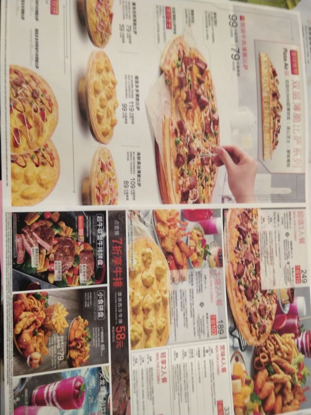 牛排,超级至尊比萨(芝心普通装),芝心比萨,鸡翅,冲绳黑糖爆浆蛋糕,抹茶雪域蛋糕,北美特色枫香烤翅,必胜客经典意式肉酱面,美式大薯格,鸡茸蘑菇汤,日式照烧鸡腿炒饭,人气重磅拼盘,红柚气泡乌龙茶,白桃气泡乌龙茶,北京潮鸭比萨S,榴莲多多薄底比萨餐,浓情香鸡翼(4只),黄金夏威夷比萨,新春小食拼盘,榴莲多多比萨