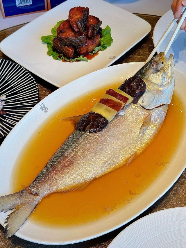 天麻鱼唇拆烩鱼头,糖醋仔排骨,京葱目鱼方,清炒凤尾虾,黑松露鹅肝包生菜,大煮干丝,红烧肉焖鱼唇,淮扬清炖狮子头,凤梨酿紫米,提拉米苏,羊肚菌爆和牛,热炝明虾片,葱白热炝明虾片