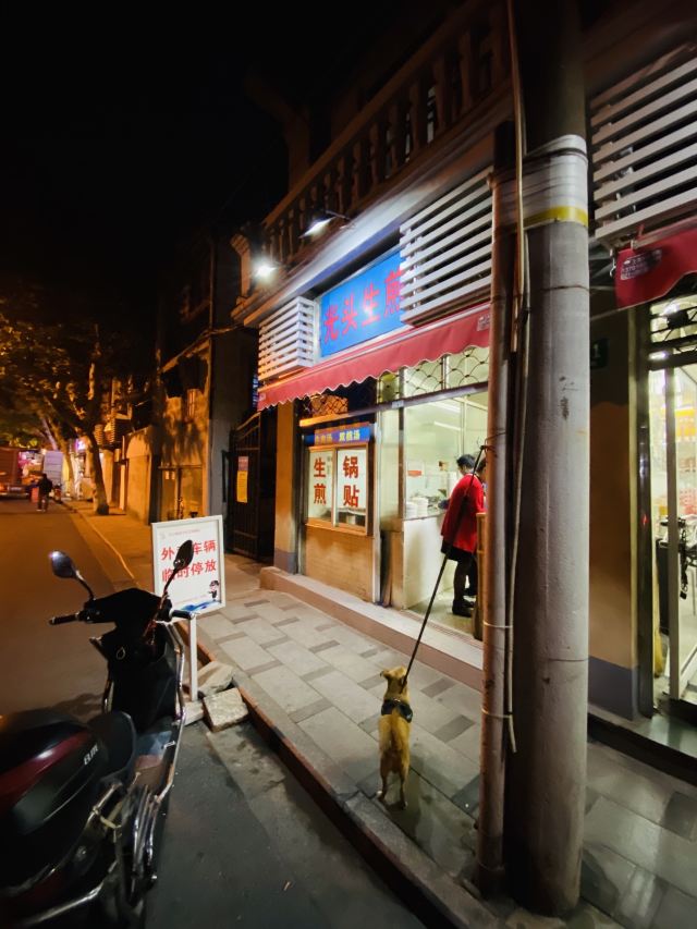 乌圆小丸子肚子已经吃了很饱啦, 但是在附近怎么不能错过这家的生煎那 对这家的生煎包可是长草已久嘞, 那还好是晚上去的所以不用排队 早上的时候生意肯定是爆棚的 为什么呀门口居然有写着外卖的车子请停在这里 那说明早上他的生意得有多好呢 发扬吃货的本质,吃晚饭吃的饱饱, 还特地走过去吃一下, 在心中长草已久的店 没到店门口被店门口的小狗吓了一下 还好老板和老板娘在很热情的说没事儿, 没事儿,他不吓人哒。 他很可爱哒他不会怎么样的 看看然后往里张望老板娘和老板很接玲子的说是不是要生煎 生煎还有呢 太好了我在看店家里情况觉得是不是快关门了啥都没有 他们居然看出了我这个吃货的心 锅贴没有呀?生煎还有 好吧, 至少留了一个品种给我, 我还是算满足的。 而且老板娘特别的贴心小姑娘吃一两就够啦我们要减肥的呀 美女都是饿出来的 上海阿姨的本色聪明伶俐。 这个阿姨的发型看的出来对生活是非常有要求的这个头发可是当年风靡上海滩挺刮的不得了 一个对自己的发型都如此坚持讲究的人 生煎怎么会差呢?不和你们说啦, 赶快一口一口吃起来。小时候的味道!
