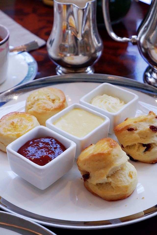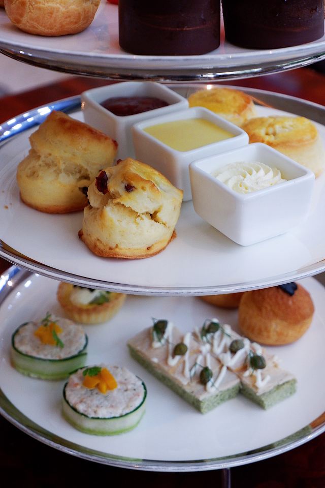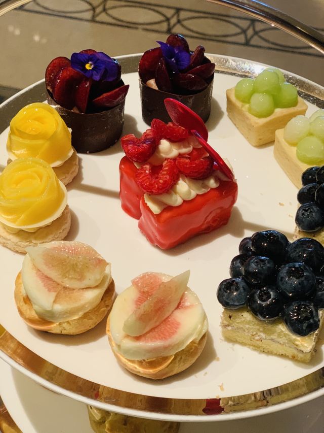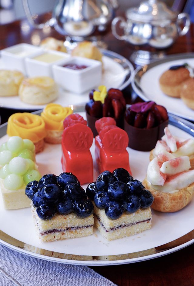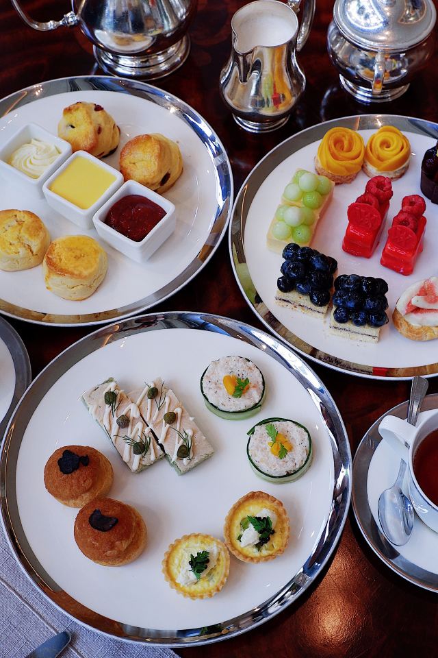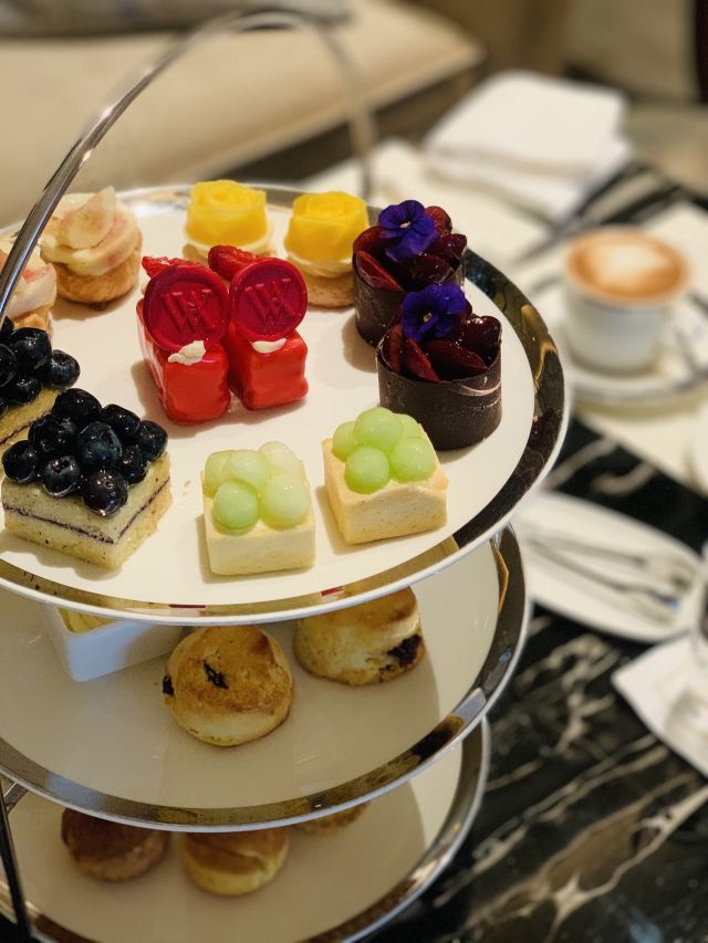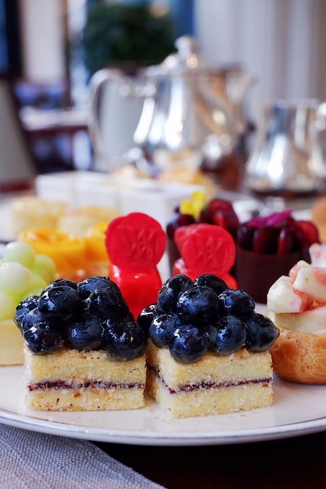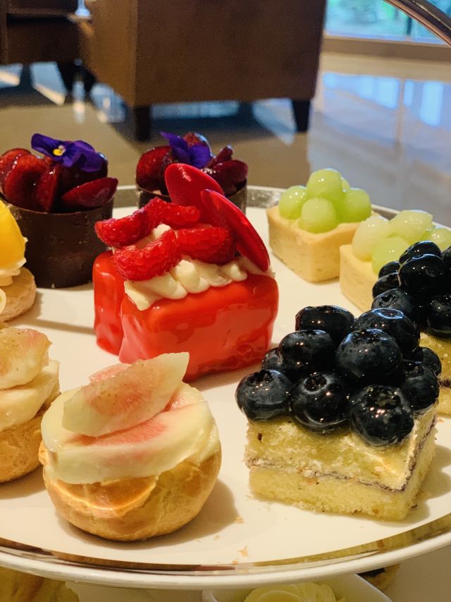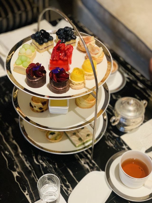 Peacock Alley ( Waldorf Astoria Shanghai The Bund )周末少不了下午茶的陪伴 一直很爱华尔道夫的司康 这次看到他们家新出了夏日水果挞系列 果断走一个 他们家的红丝绒下午茶属于是最经典的三层系列 餐具摆盘精致漂亮 看上去很是洋气 出片也非常的好看 缤果红丝绒双人下午茶set ¥588/工作日 ¥688/双休日 需外加15%服务费 下午茶套餐内包含两杯起泡酒+两杯咖啡/茶 从底层到顶层依次是咸点→司康→甜点 第①层 咸点系列 鹅肝松露慕斯泡芙+鸡肉水瓜柳抹茶面包+虾仁芒果色拉黄瓜裸麦面包+芦笋挞配奥西特拉鱼子酱 第②层 司康系列 原味司康+蔓越莓司康 配草莓柠檬果酱/特浓奶油 第③层 甜点系列 蓝莓椰子蛋糕塔+树莓红丝绒蛋糕塔+哈密瓜塔+无花果修女泡芙派塔+樱桃巧克力慕斯塔+芒果塔 建议从最下面往最上面吃 由咸到甜依次享用 红丝绒不愧是华尔道夫的招牌 味道独特 层次感丰富 司康也非常的好吃 拍照要快 一定要趁热吃哦 搭配特浓奶油 这味道真是绝了 松软可口 奶香浓郁