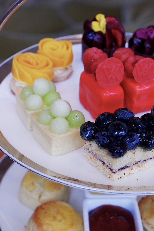 Sasa0828周末少不了下午茶的陪伴 一直很爱华尔道夫的司康 这次看到他们家新出了夏日水果挞系列 果断走一个 他们家的红丝绒下午茶属于是最经典的三层系列 餐具摆盘精致漂亮 看上去很是洋气 出片也非常的好看 缤果红丝绒双人下午茶set ¥588/工作日 ¥688/双休日 需外加15%服务费 下午茶套餐内包含两杯起泡酒+两杯咖啡/茶 从底层到顶层依次是咸点→司康→甜点 第①层 咸点系列 鹅肝松露慕斯泡芙+鸡肉水瓜柳抹茶面包+虾仁芒果色拉黄瓜裸麦面包+芦笋挞配奥西特拉鱼子酱 第②层 司康系列 原味司康+蔓越莓司康 配草莓柠檬果酱/特浓奶油 第③层 甜点系列 蓝莓椰子蛋糕塔+树莓红丝绒蛋糕塔+哈密瓜塔+无花果修女泡芙派塔+樱桃巧克力慕斯塔+芒果塔 建议从最下面往最上面吃 由咸到甜依次享用 红丝绒不愧是华尔道夫的招牌 味道独特 层次感丰富 司康也非常的好吃 拍照要快 一定要趁热吃哦 搭配特浓奶油 这味道真是绝了 松软可口 奶香浓郁