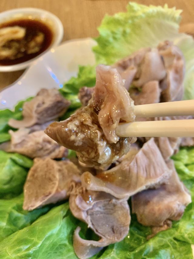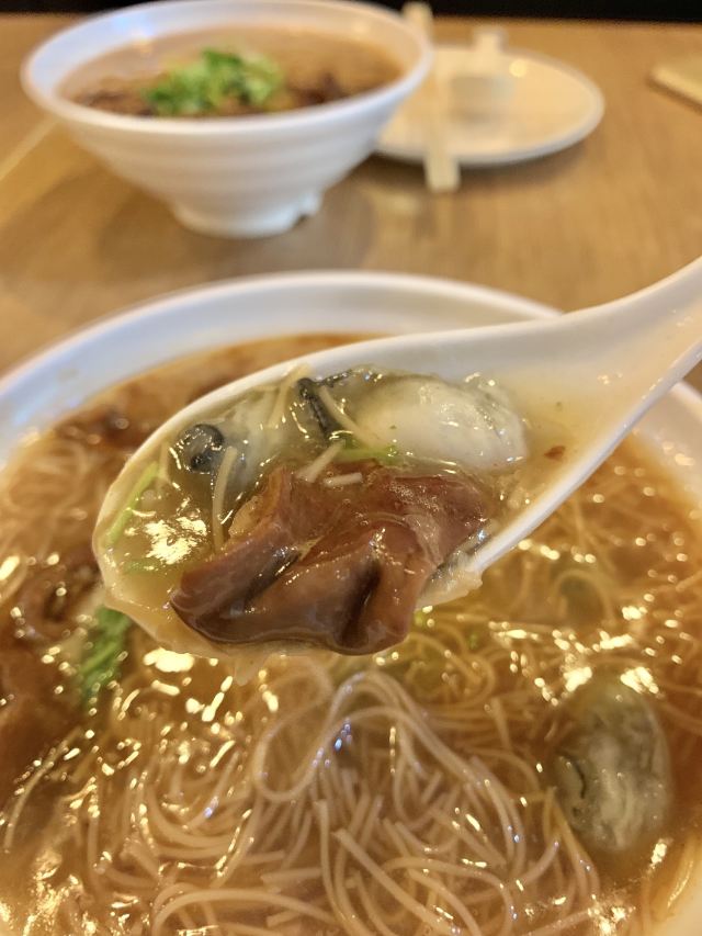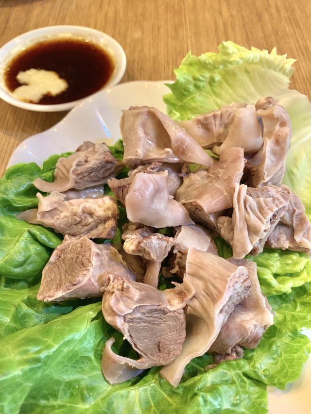 Ajinmianxian╮╮╮ Ⅶ☽ 卍 ╭╭╭ N年前的阿锦面线,在附近的路口,好几年没来了,现在的地方➡️离以前百米左右,沿马路的一排餐厅,各家经营特色,整体搭配上去了,停车就在旁边,很方便️ 老板还没换,仍以台式料理为主,增加了一点新加坡菜系,多道海南鸡饭,堂内墙上挂着李光耀总理的照片,嗯…有点… 肝连肉,白灼的经典台式小吃,蘸着带蒜蓉的酱油膏,一块块肉中有肥,切的稍大,实在了些,倒也是实打实的一盘 大肠蚵仔面线,看勺起勺落,大肠蚵仔尽在手里到口中,桌上摆些调味品,会更细心,我比较喜欢加点醋提味,看看中午客人还不少,服务员忙来忙去,没提 ㊗️店家和气生财、生意兴隆