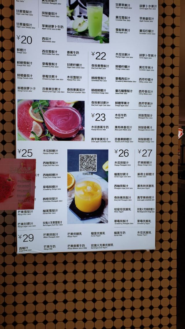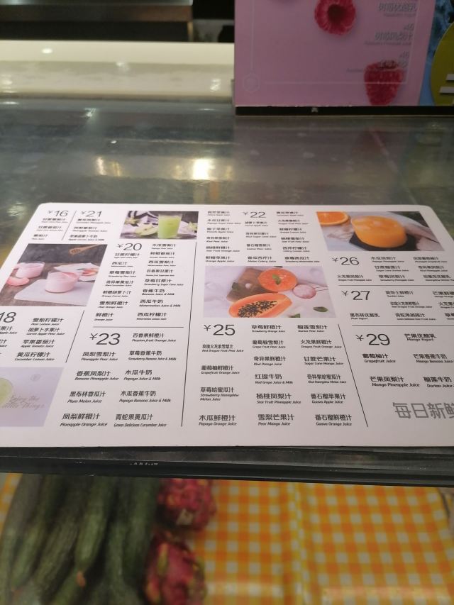 甘蔗柠檬汁,樱桃雪梨汁,莲雾香瓜汁,黄瓜雪梨汁,牛油果奶昔,草莓优酪乳,草莓雪梨汁,荔枝柠檬雪梨汁,牛油果甘蔗汁,玫瑰火龙果鲜橙,甘蔗雪梨汁,番石榴雪梨汁,木瓜雪梨汁,榴莲牛奶,西瓜汁,木瓜鲜橙汁,奇异果雪梨汁,木瓜香蕉牛奶,芒果鲜橙汁,芒果雪梨汁