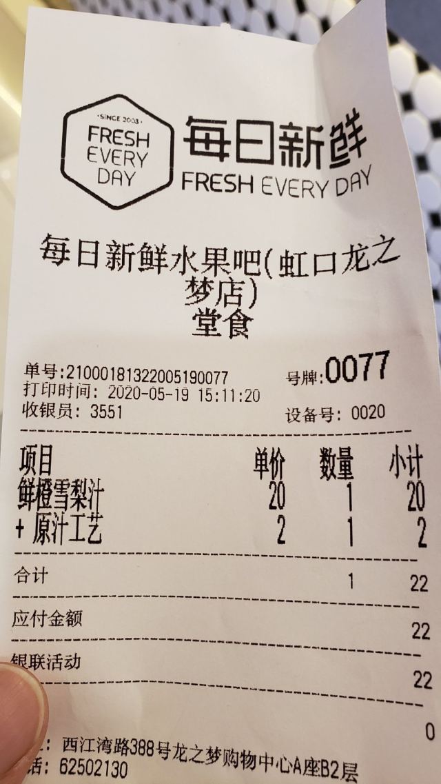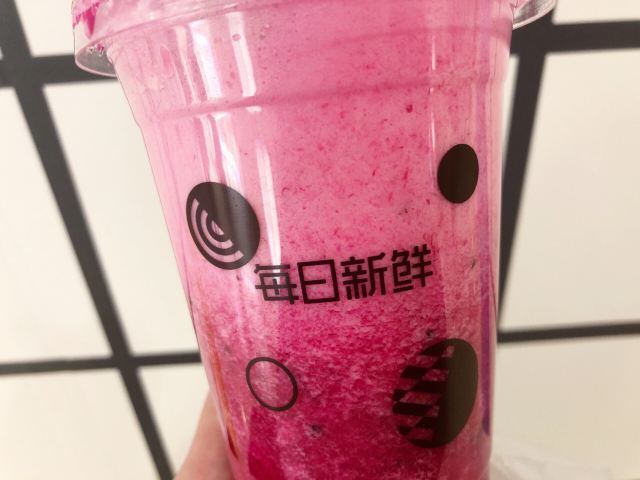 每日新鲜水果吧连锁店很多,这家在虹口龙之梦楼下,通往地铁口的店铺,生意挺好的,不少人买果汁,最近也有鲜榨果汁第二杯半价的优惠。 因为一个人就买了一杯,鲜榨果汁一个小时喝完比较好,要了火龙果凤梨汁,鲜榨的很快,口感酸甜浓郁,最近在家也是吃火龙果菠萝比较多,爱了爱了!
