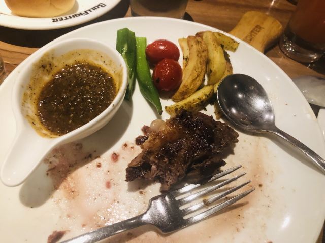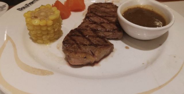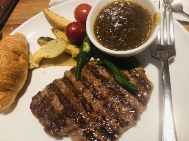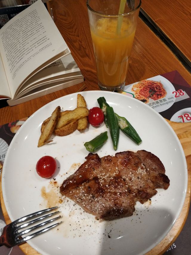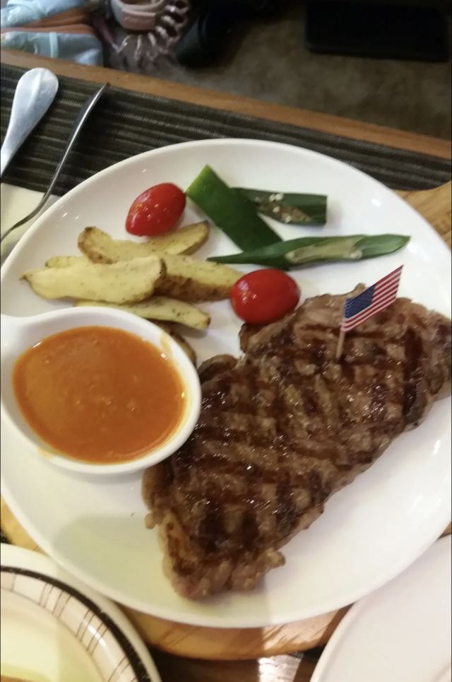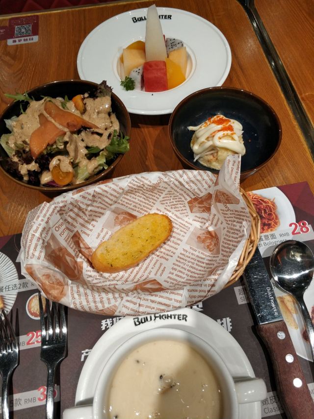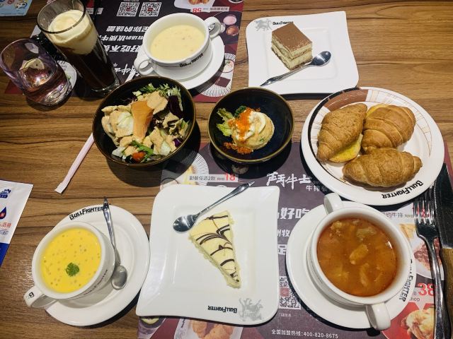 【口味】听名字就知道主菜是牛排,牛排有软有硬,口味还是比较偏重的,总之味道还不错!