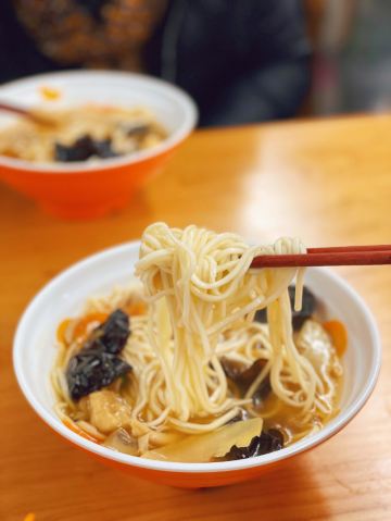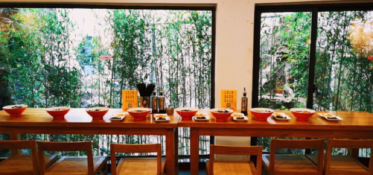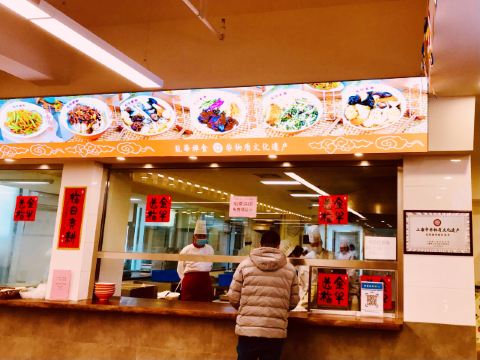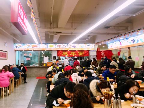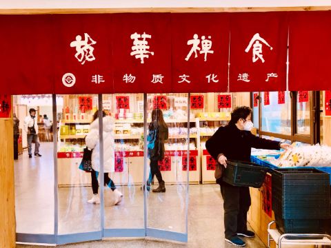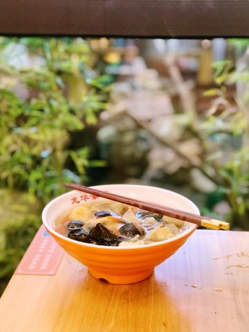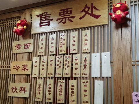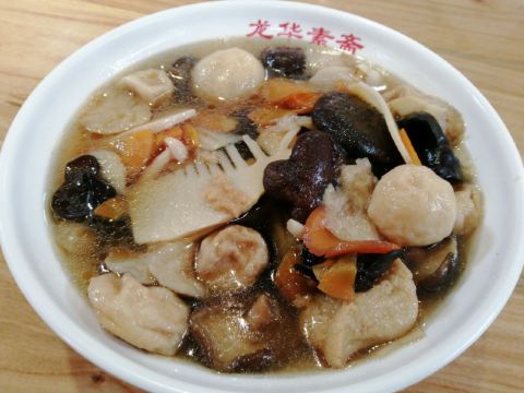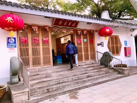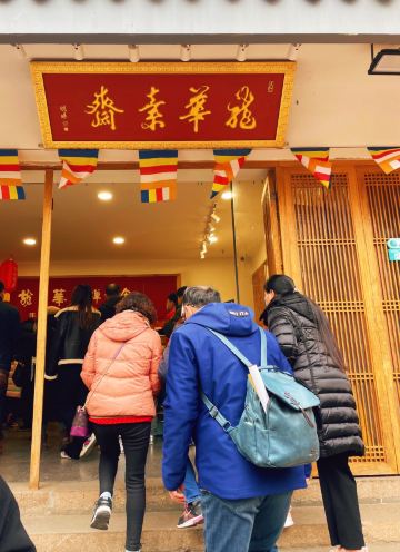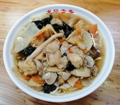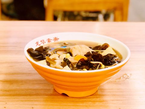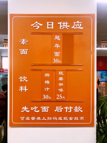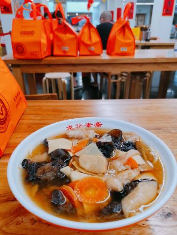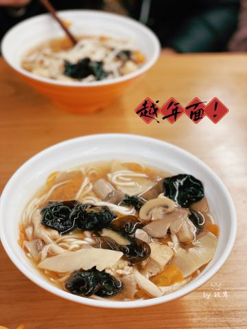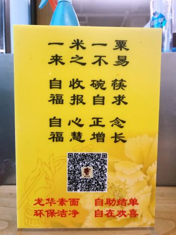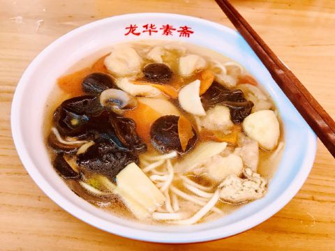 LongHua SuZhai Guan (LongHua Road)龙华素斋,位于龙华古寺后花园中,堂吃的素面、素菜料足味美。每到初一、十五、佛教节日,以及农历新年,来龙华寺礼佛的香客摩肩接踵,礼佛完毕,到后花园素斋吃碗素面的香客也非常多。 为防止人流过于密集发生拥挤等不安全状况,龙华素斋在立春这一天集中供应“越年面”,香客直接到厨房窗口领面,吃完自己扫桌上二维码付款或自行投币,还配了不少志愿者现场指引,使得吃面人群快进快出,运转流畅! 管理非常棒!👍👏🏻