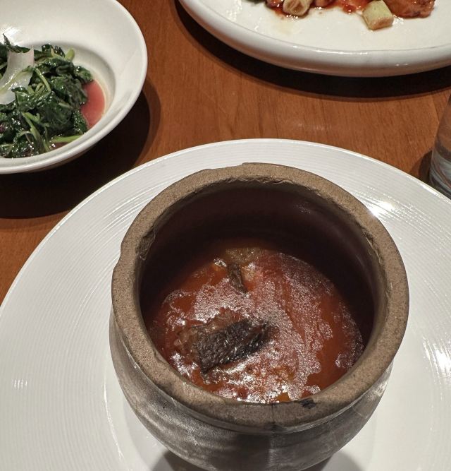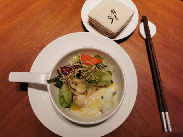 Shandao (putuo)优质评价 种草有些日子了,约饭好友特地选了这家,可能期望太高,有些落差,整体还行。普陀店在一个不太热闹的科技园大楼的六楼,找到大楼电梯的时候感觉有些破烂,还好上到六楼电梯打开整体环境还行。双人套餐只能在大厅,大厅其实只是一个小小的过道,三个条桌再加一个圆桌,其他全都是包房,估计包房体验会好很多。 入座先送了一盘海苔小点心,套餐里大部分都是位菜,每份菜看上去都小小一份,全套吃下来很饱,还剩下了一些。味道还行,有些调味吃不太习惯,整体感觉餐食的热度不够,缺少中餐的烟火气。店里没有任何背景音乐,可以清晰的听到服务员整理餐具的声音,不太习惯。 停车在园区的地下停车场,10元/小时。 如果下次再来,看看包房和非套餐的水平如何。