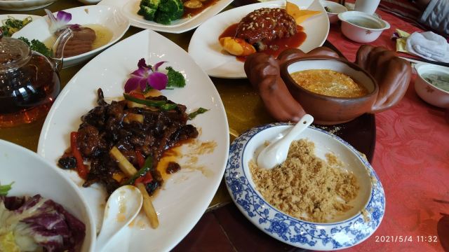 铁木儿爸爸好吃,海鲜豆腐煲,,米饭,好像有糯米?,三片汤,椒盐芋蛋,,