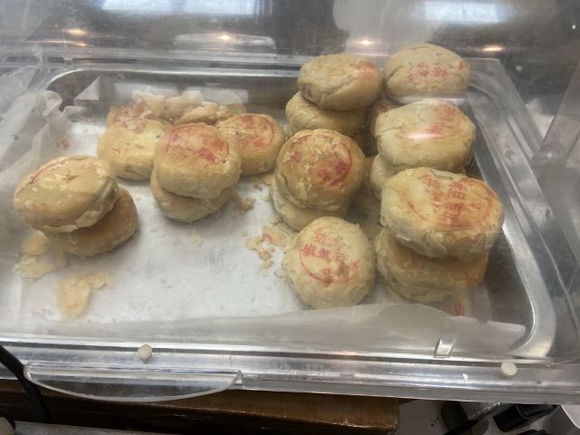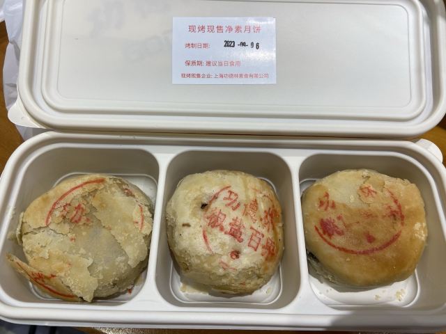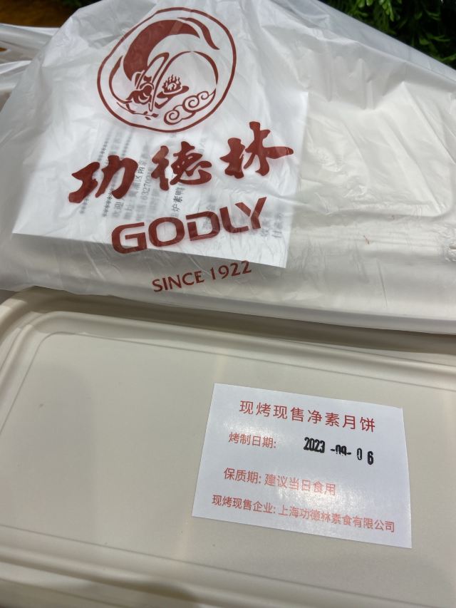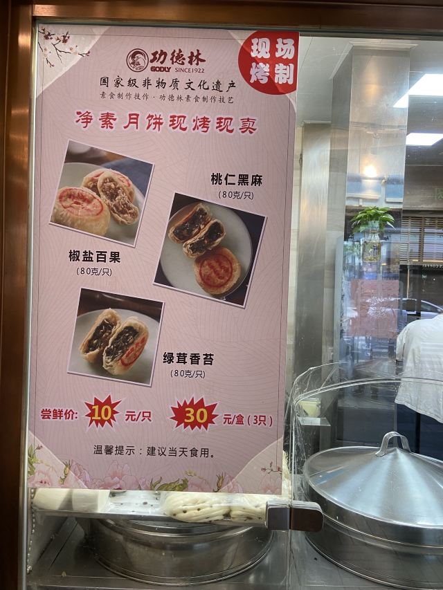ShangHai GongDeLin (NanJing West Road)上午走过南京西路功德林总店,看到有现烤净素月饼出炉。想想中秋节快到,于是每样各挑一个装一盒。 【口味】“绿茸香苔”口感最好!其它两款也无齁甜的感觉。 家里老人吃得挺满意。