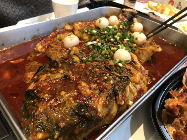 旦复旦兮Killer川香口味的烤鱼,清江鱼尤其入味好吃,配以各色蔬菜,很下饭。