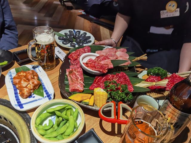 火了🔥很多年的一家日本烧肉店 不能订位 就挺早到了 四个人点了两轮 拼盘还有横膈膜牛小排都点了 个人觉得牛小排全场最佳 牛舌也不错 拼盘里的牛排也蛮好吃的 然后横膈膜和薄切牛上脑有一丢丢微酸 薄切牛上脑的油脂陪着米饭和生菜🥬很有幸福感,墨鱼肠属于正常口味,牛肠个人有点吃不习惯.生拌牛肉木有了,sad.炒粿条咸了点.烧肉酱也偏咸了点. 牛肉糜酱拌🍚很适合,自助的冰淇淋奶味挺重的 但只有一个口味,同伴说其他店好像口味多一些?
