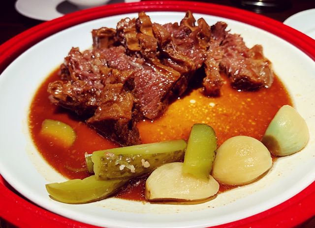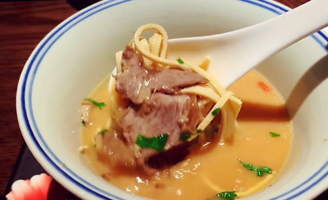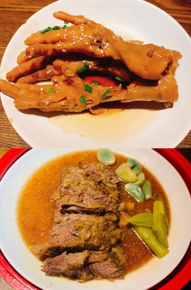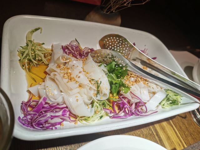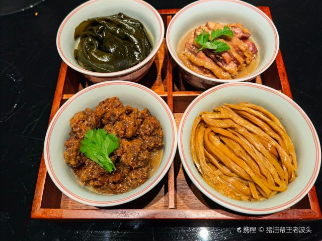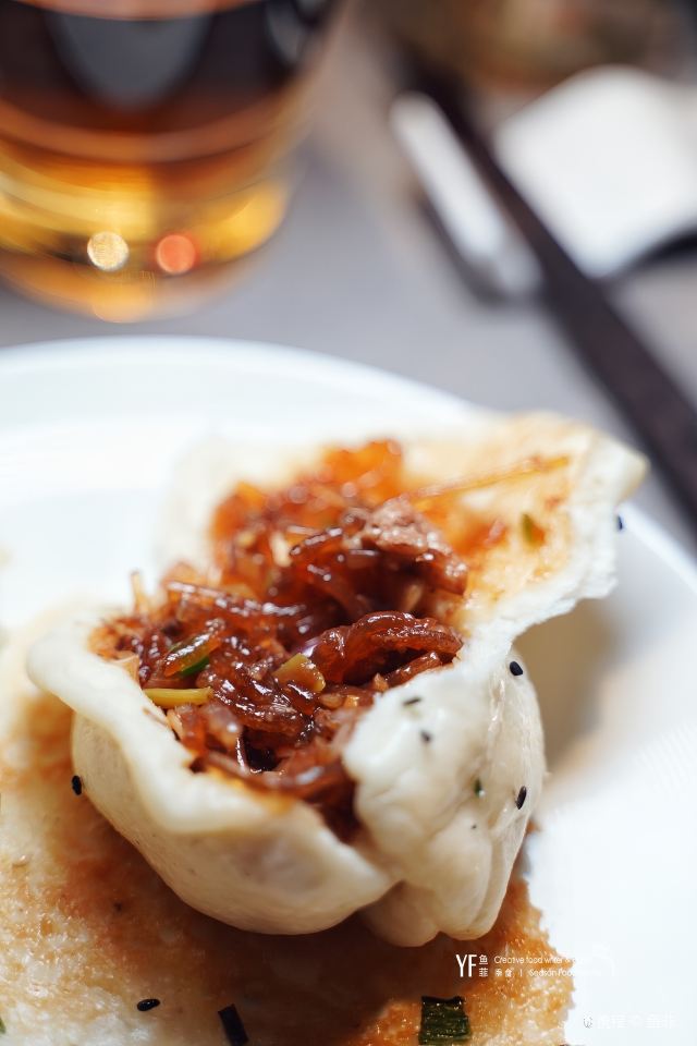 憨人K怎么点都不太会出错的安全型牛肉店。 工作日午市过来,有单人套餐(58RMB)。两个人的话,推荐一个套餐+单点一些别的想吃的,量正好,又能一下子多尝几道。 推荐 「热卤中原鲜黄牛」(59RMB/小份) 两人点小份就够,黄牛肉煮的偏酥,调汁都有煮进去,加上牛肉本身的香味,一口满足。 「油泼烩面」(38元) 两人一份正好,面很劲道,除了蒜多了些,建议拌前调整下,这道真的好吃的不可不点~有种大盘鸡里最爱的裤带面,终于可以不用吃鸡就能吃到的满足感。 「黑松露牛肉水煎包」(9RMB/个) 洋葱牛肉馅的煎包子,就是不会出错啊。 「熬足4小时牛肉汤」(19元/碗) 口感浓醇,香!别怪没提醒,此汤一定趁热喝,凉了后牛肉的膻味就出来了… [环境] 桌上的鲜花sense和用心都十足,为桌面布置疯狂打电话 值得一来的牛肉专门店,推荐!