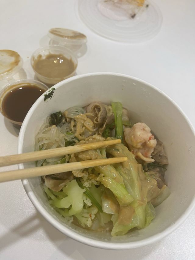 被同事安利的,减肥期间除了色拉没想到有这么棒的选择。 性价比很高,一份大概二十多可以搞定。可以依据自己喜好选很多蔬菜,最爱卷心菜和青菜。肉的话选择也多,可以选没有淀粉的肥牛,虾仁。 酱料推荐辣酱和芝麻酱,真的香。 以后就当晚饭了。