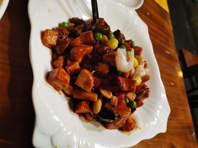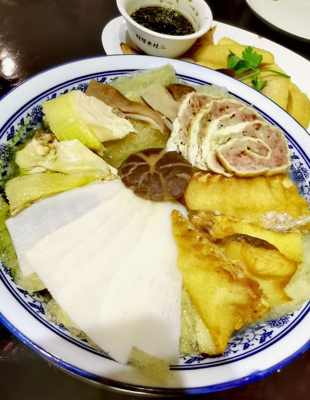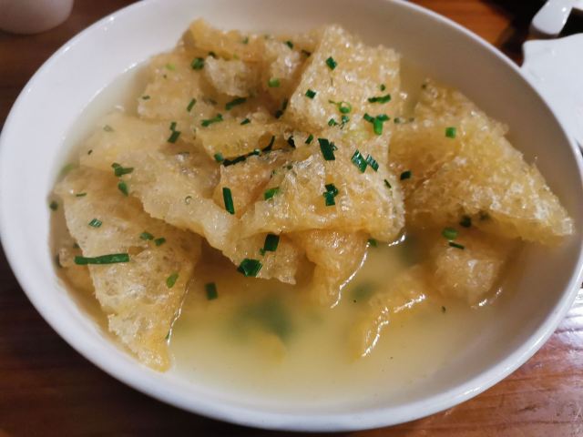 细雨蒙蒙,约了一个女性友人来三林吃饭,建筑是典型的老上海建筑,一共点了四个菜 三林老肉皮:本帮馆的特色菜,也是三林的特色,吃上去感觉很脆,汤汁很入味 八宝辣酱:有鸡胗,有猪肚,有虾仁,有竹笋,有豆腐干,有花生米,有点太甜,辣味有那么一点削弱 胡辣汤:豆腐,鸭血,肉丝,晚上有点冷,辣辣的酸酸的正好多喝点御寒,喝完出门感觉浑身热乎乎的, 还有一个蛤蜊炖蛋:感觉一般般吧,蛋味道比蛤蜊好吃,蛤蜊肉不大好吃