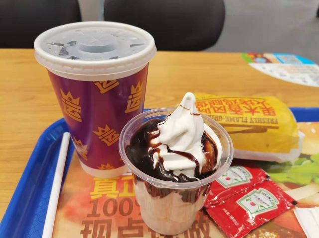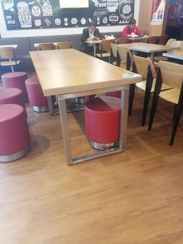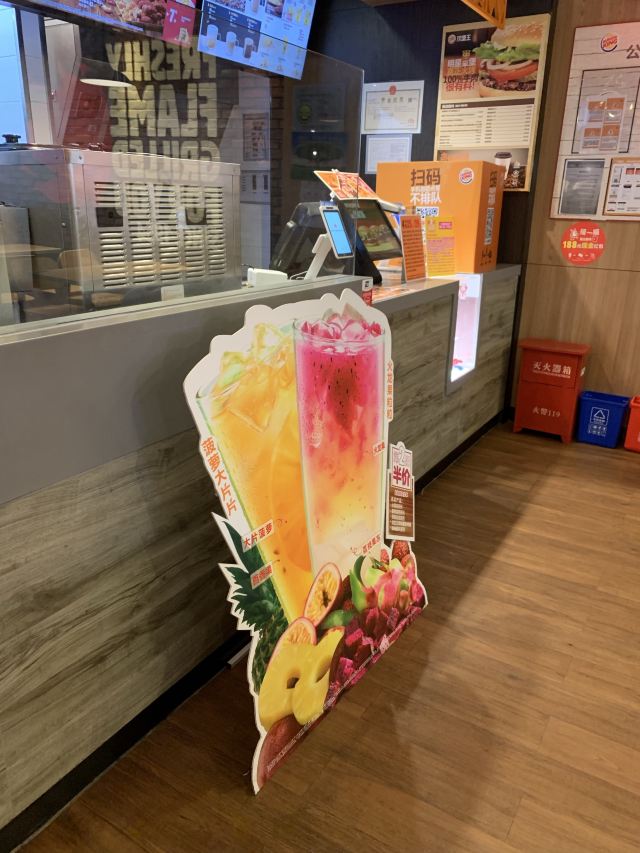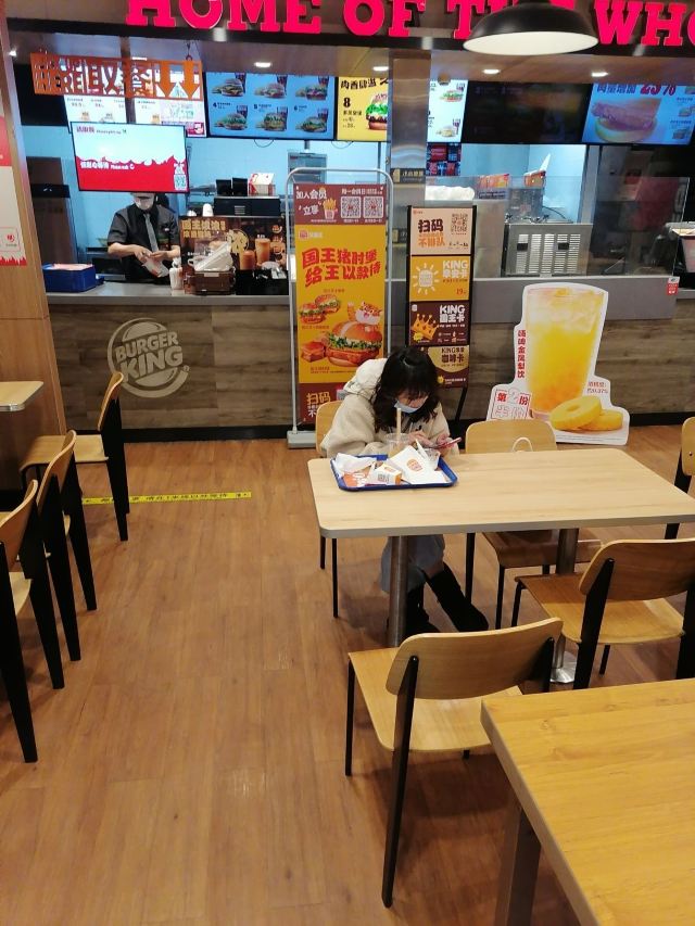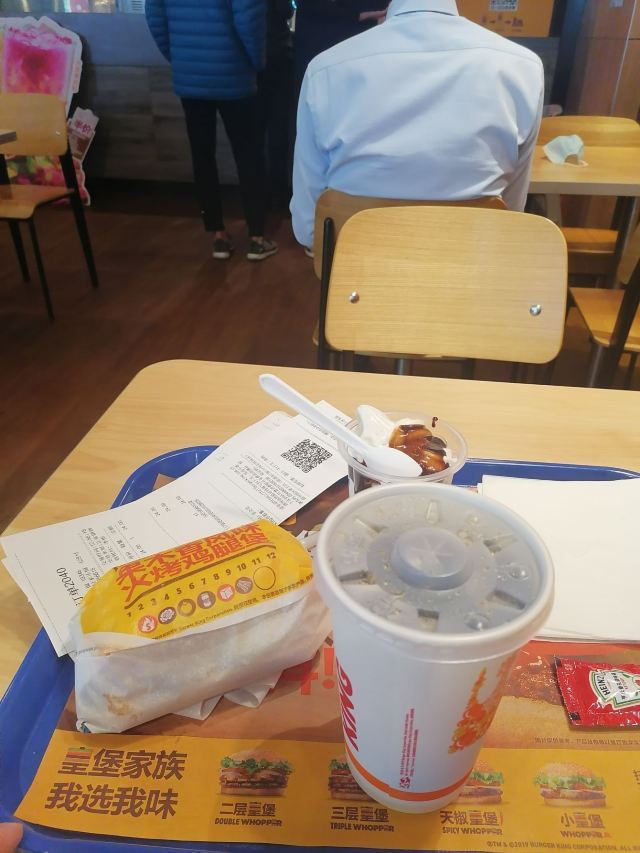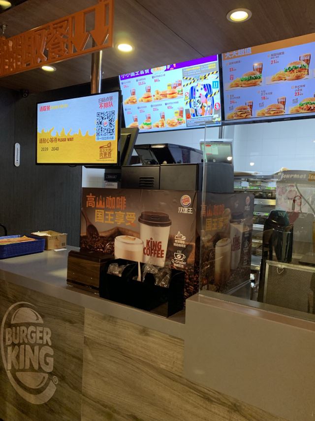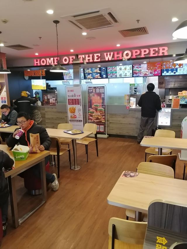 金桥家乐福一楼卖汉堡的有2家,这2家正巧又是我搞不大清楚的牌子,哈哈哈,所以找“汉堡王”的我第一反应是去了“赛百味”的店铺~~ “汉堡王”在卖麻辣烫的隔壁,碧云板块外国人多,工作日中午对面国际学校的外国学生还是会来吃汉堡的,所以生意还可以。 店堂挺大挺干净宽敞的,店员有好几个,服务态度蛮好的,手脚也快。
