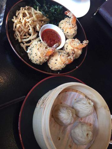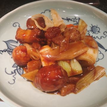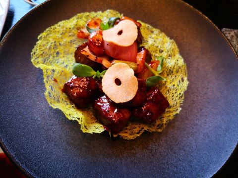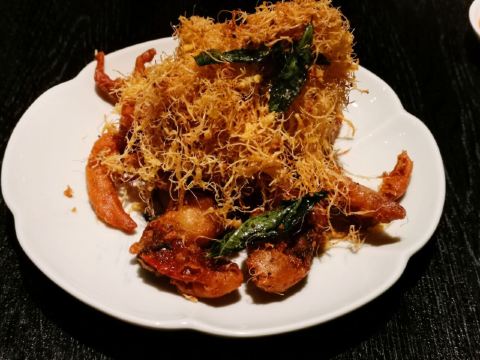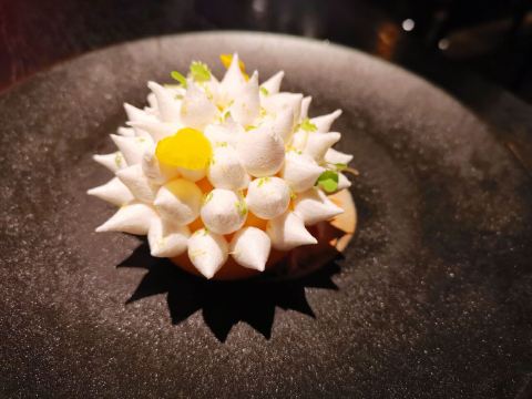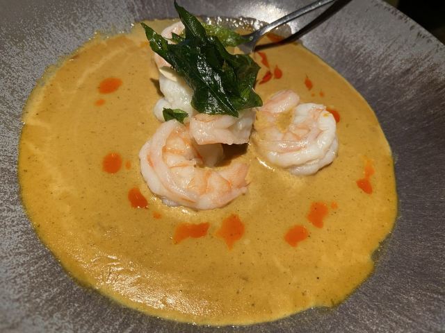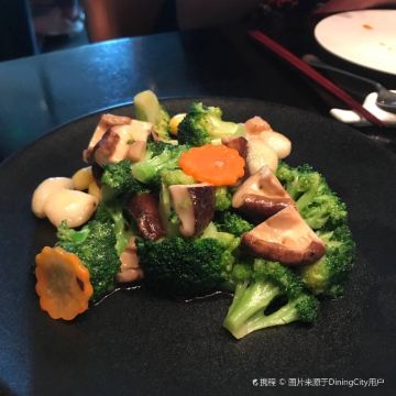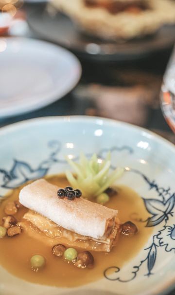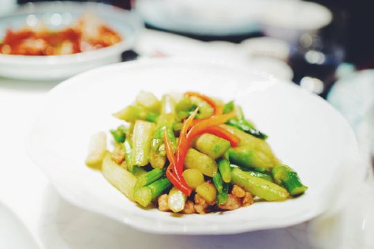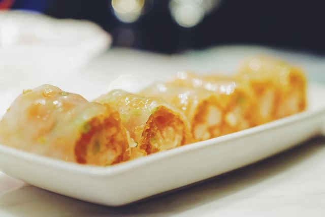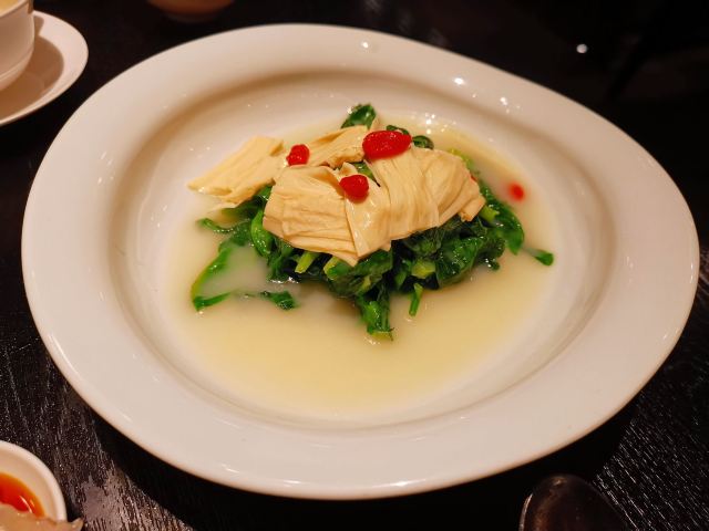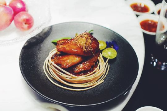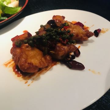 轻轻的一个蚊当晚最爱的一道菜,是这道中式柚子咕咾肉。素来对咕咾肉无感的我,竟然津津有味连食三块…… 究其原因有二,调味不是番茄酱的一味甜腻,酱汁风味平衡有层次感,加上微苦微酸的柚肉,更是点睛;二来就是这块肉选得好,以往咕咾肉多讲求肥瘦相间,甚至是过分追求肥肉的油香效果,反倒失了本味;这一块梅肉来自5J的冰鲜小黑猪肉,吃橡果放养长大,每头猪平均活动范围两公顷,比你我都活得逍遥自在,嫩度与鲜度都非普通猪肉可比拟,自然效果非凡。 鳕鱼与芦笋,调味也是沿袭了港府大店风范。不过这里的点心,唯一比较中意的一道是鲜虾炸两,口感上也是比较讨巧的制法,至于其他的点心菜色,还是有待进步吧~