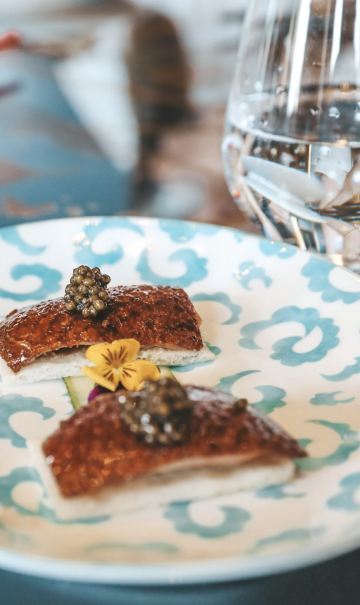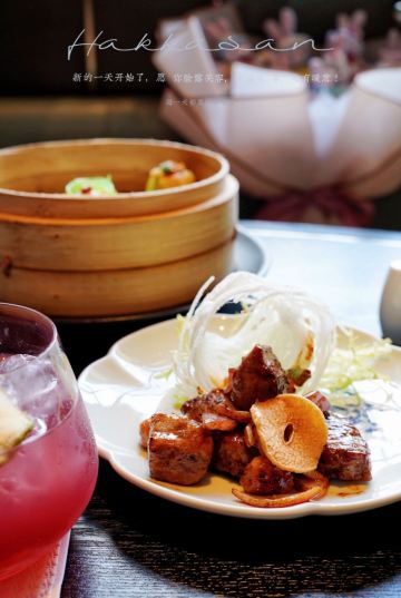 史先生与黛小姐这家鱼子酱片皮鸭C位出道💕壕气冲天🔝 Hakkasan再度绽放!光芒是否依旧还在? 午市套餐有338和398两种,感觉性价比还是超高的。但不知道为何午市还是分外冷清,考虑到景观位较少,我们还是提前了一周定的位。 【口味】 「鱼子酱片皮鸭」 刚开始觉得¥688元才半只(半只有8片,2盘)性价比不高,而且类似这样的做法的店有很多。但作为Hakkasan的招牌菜,还是点了。汁水丰富的鸭皮略带鸭肉,与香软面包完美贴合,鱼子酱点缀使口感更加丰富。但单论烤鸭口感这家完胜,一口气吃了一盘。绝对是必点的一道招牌。 「四式点心拼」 Hakkasan 家点心一直都是深得众人心,推出四式点心拼盘,不仅好食还好看,更像是一朵朵花。充分体现了大厨粤菜点心的功底。 「蒜子黑椒牛仔粒」 这款牛仔粒很明显肉好油脂多,牛肉粒入口即化,一口下去,肉又香又嫩,汁水丰富,口感饱满。 「香酥鸭沙律」 口感结合的还是很好的,鸭肉酥脆不柴,再搭配了清香柚子,作为前菜让人胃口大开,稍显不足的就是有点咸了。 【环境】 外滩十八号的景观位,环境肯定没话说。东方明珠就在眼前。直接欣赏着外滩美景,吃着美食,何其乐哉! 【服务】 可能是中午比较冷清的关系吧,服务异常的好。上菜也快,全程在线。感觉很对得起加收的10%服务费。