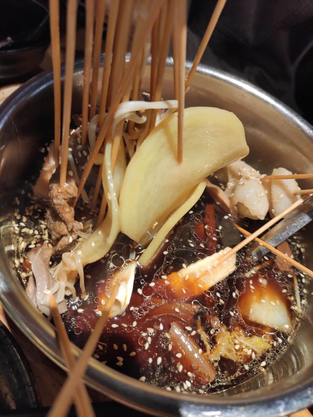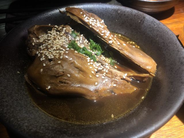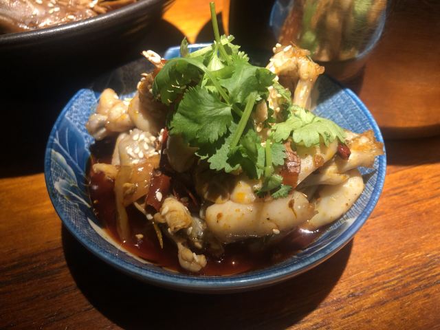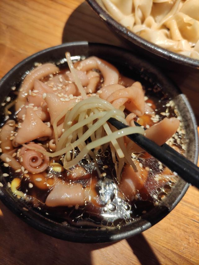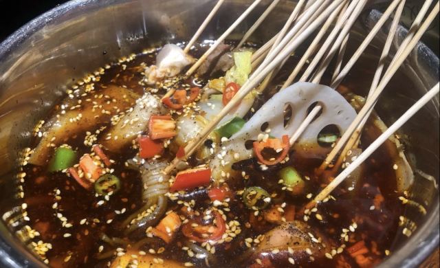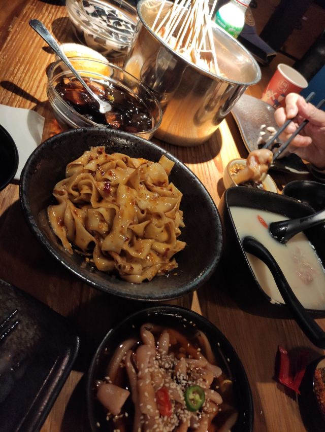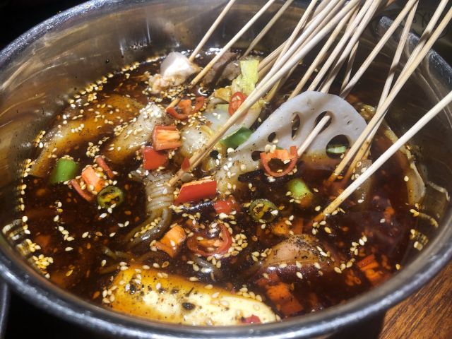 必吃榜推荐的7年成都串串料理老店,成都人个个 说好,赶紧过来拔个草! 🌶归蜀地.环境🌶 这家串串料理位于一个小巷子内,一打开门就闻到扑鼻的串串香气。零下六度还有不少人在寒风中排队等位,估计都是被串串的香味吸引过来的。 店面看似不大,却有三层。墙面上的和黑板报有点小清新,来光顾的大部分也是年轻的帅哥美女们。 🌶归蜀地.服务🌶 过去的时候基本坐满了,只能坐在靠近门口的位置。 服务员小姐姐担心门开进开出我们会被冻到,楼上有空位了主动提出给我们挪位,搬上搬下的,辛苦了。 现在只要到他家撸串还送2021年定制扑克牌,一边撸串一边打扑克,太欢乐啦!另外他们的限定周边也好看,值得入。 |串串^ 来他家最主要的目的当然是撸串啦!点了10来串,也就50不到。麻辣牛肉和厚切牛舌必点,肉质厚实,入味,麻麻辣辣的,正宗成都味。 另外大片里脊肉、掌中宝、鸭胗等也是必点的。 |冒脑花^ 成都人最爱的脑花必须来一份,吃上去有点像豆腐的口感,没有异味。 |冒鸭肠^ 每次吃火锅必点鸭肠,他家的鸭肠脆脆的,有嚼劲,没有想象中的重辣,适合大部分人的口味。 |担担面^ 端上来的时候整碗面被花生碎覆盖了,花生碎和麻酱拌在一起很香,好吃。 |老妈蹄花^ 吃多了辣来碗老妈蹄花温暖一下胃,蹄花鲜嫩,入口即化,汤头浓郁,不愧是八小时熬出来。 想拔草高性价比的成都串串料理,就来归蜀第吧。