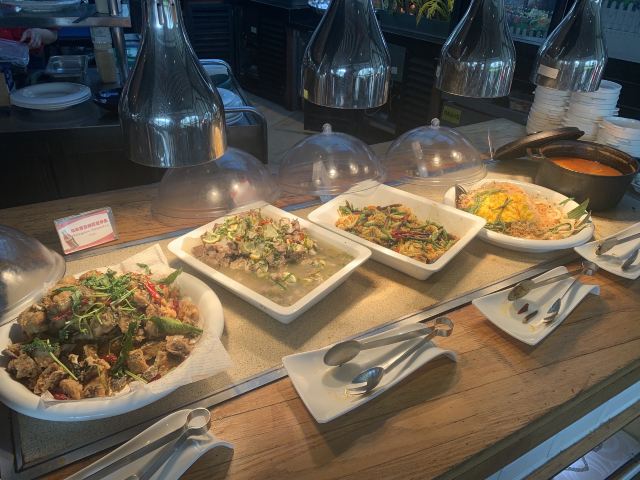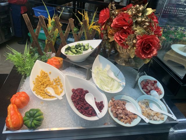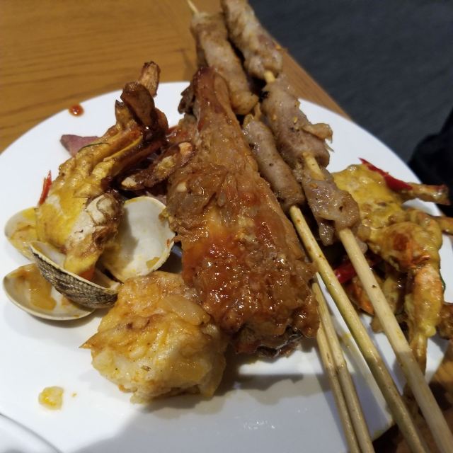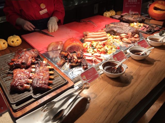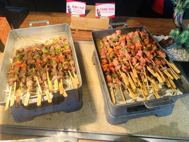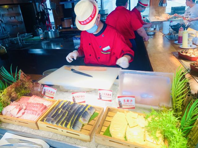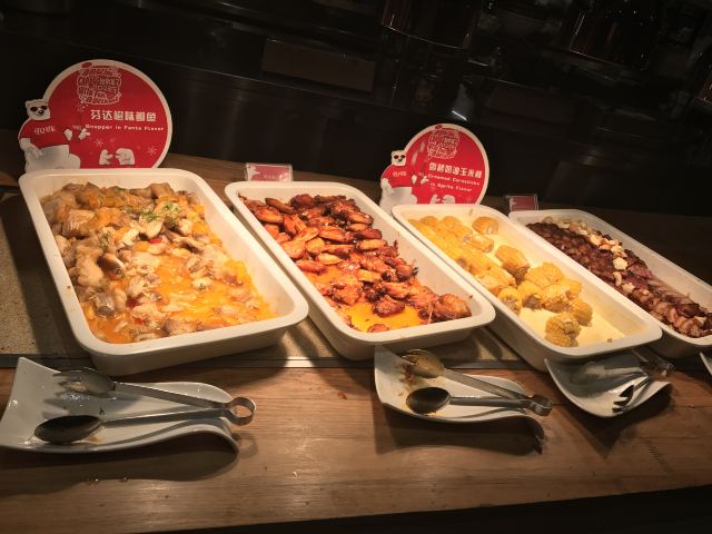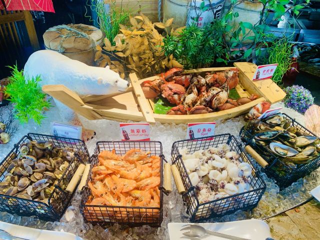 可乐鸡翅,三文鱼刺身,西班牙海鲜饭,云吞面,羊排,龙虾,冰激凌,海鲜,水果,油爆虾,红豆蛋挞,巧克力喷泉,猪猪包,梭子蟹,欢乐下午茶
