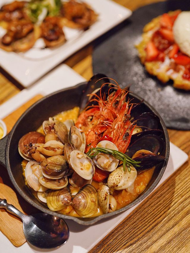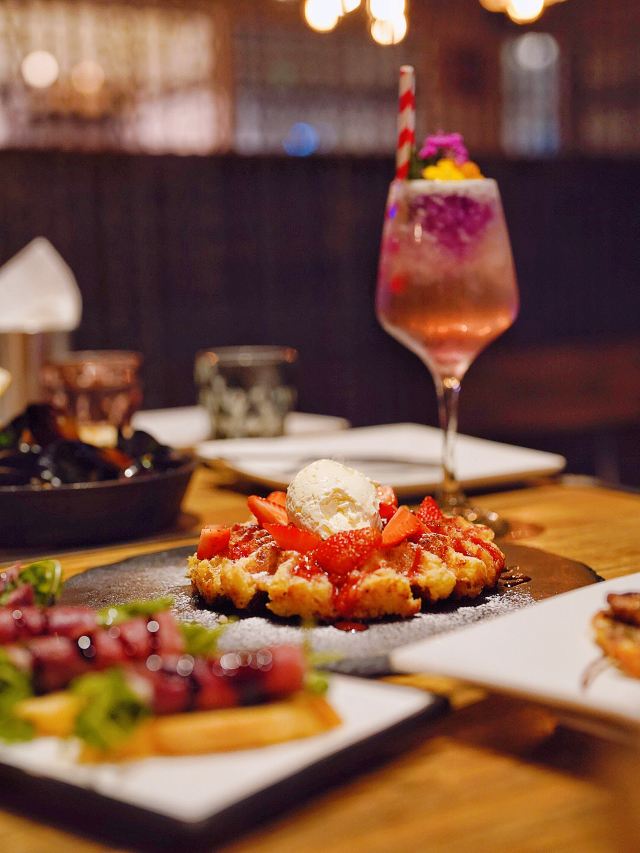 加油干饭呀种草这家Liquid Laundry很久了,没想到菜品跟鸡尾酒一样出挑,在酒吧里用餐真是别有一番格调,小酒一杯,小腿一翘,才是周末的正确打开方式✅ ❤️香煎鹅肝配水果芥末酱❤️ 外焦里嫩的香煎鹅肝,光是摆盘就很精致,没想到口感更是惊艳到我,浓浓的油脂香气,在口腔里回味很久~ 🧡鱿鱼圈🧡 将新鲜鱿鱼高温油炸,丝毫没有影响它的Q嫩弹牙,外面裹的面粉只有薄薄的一层,每一口都是外焦里嫩满足感爆棚📈 🥓火腿面包🥓 用西班牙火腿片包裹清爽芝麻菜,每一口都咸香不腻,底部还有酥脆的烤面包片,把整体层次感瞬间拉满了,美味指数🆙🆙这样的tapas好吃是好吃,就是有点费酒😅 🍓草莓华夫饼🧇 现烤华夫饼外层酥脆内里松软,空气感十足,搭配奶油和草莓果肉,即便已经吃饱喝足,却依然忍不住多吃几口🥄 🍸Liquid Laundry(淮海中路店) 📍淮海中路1028号嘉华坊2楼(近东湖路)