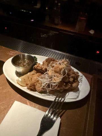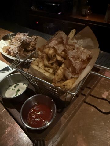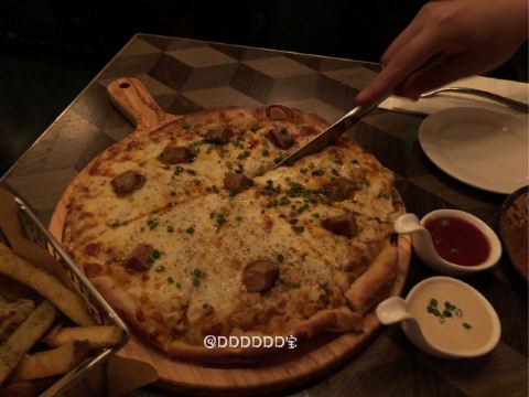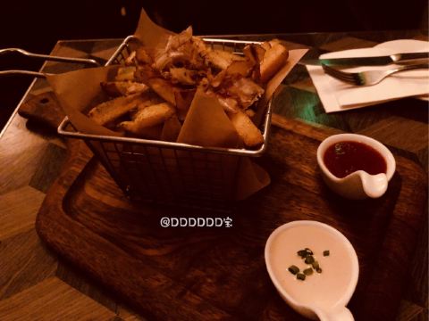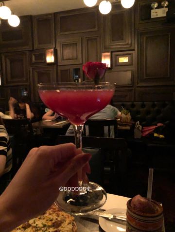 DDDDDD宝🍹工作日晚上和小伙伴来喝一杯,不想空腹喝酒又懒得转场,刚好这家可以满足有吃有喝😄一家有小食的酒吧,越晚人越多。 📍入口处小小的,一不小心就错过了,各种小机关噱头很足哈哈,从一个类似书架的门进入。三楼进入也需要玩个小游戏才可以打开门哦 🌟二楼是美式酒吧,等吃完下楼的时候二楼挤满了人,好嗨[笑哭] 三楼是日式酒吧,有吧台位也有小桌子。 🍕【鹅肝麻婆豆腐披萨】比想象中的好吃,鹅肝和麻婆豆腐的搭配,居然没有违和感~豆腐嫩嫩的滑滑的,整体感觉不太辣。披萨是薄底的。会有芝士拉丝,满足~155元 🍟【和风薯条】日系风,除了有和风飞舞,小伙伴说还有童年的味道,类似于那种回忆涌上心头的味道……什么童年的味道?尝了下原来是海苔粉[笑哭]好吧,我长大了也吃海苔所以感受不到童年的味道[捂脸]除了海苔粉,薯条本身无功无过。65元 🍸【the ispahan】挺好看的一款酒,噱头也是满足了,杯口插了朵玫瑰花🌹,上桌居然还喷了两下玫瑰花味的香水[笑哭] 口感上酸酸甜甜的很好喝,白兰地作为基酒,加上荔枝,覆盆子,很适合女生。140元 🥃【passion dance】全场最炫鸡尾酒,上桌还会有点火的表演,也是惊呆我了[笑哭] 有百香果,口味的话据说还好,没尝试。130元 🍃整个餐厅环境很暗,拍照📷有点难… 不过朋友聊聊天也是蛮开心的~
