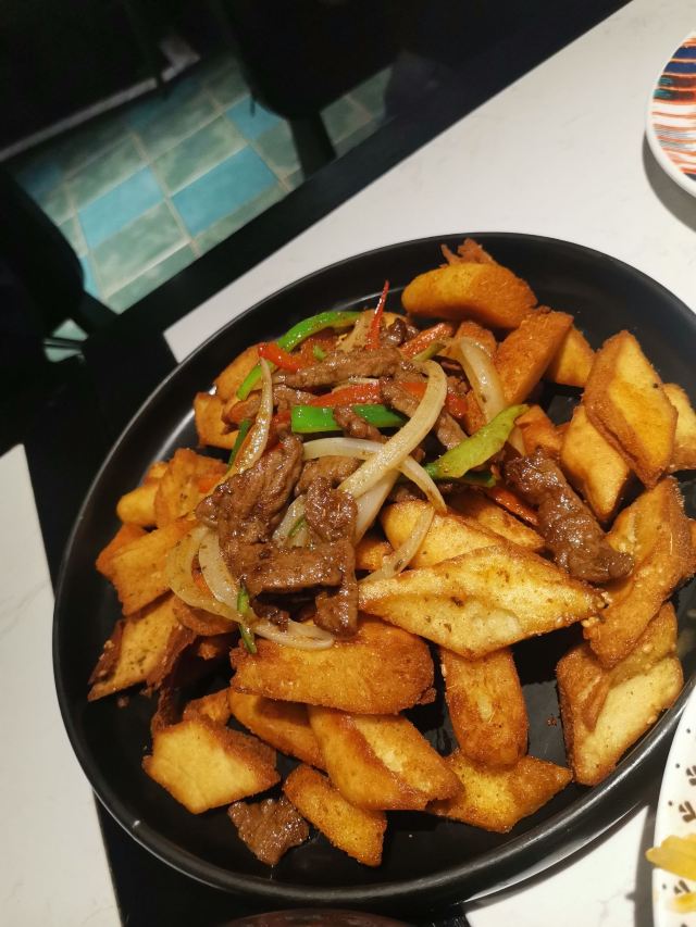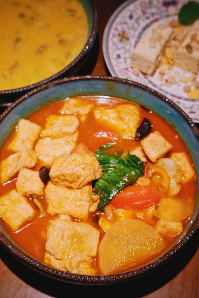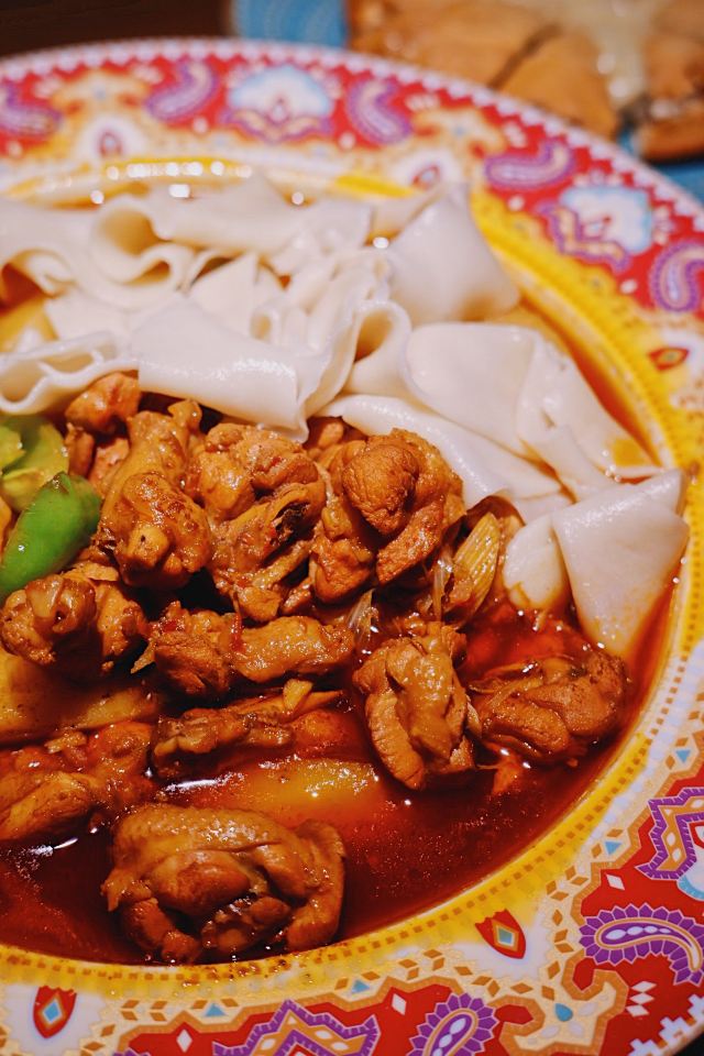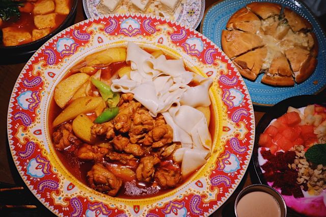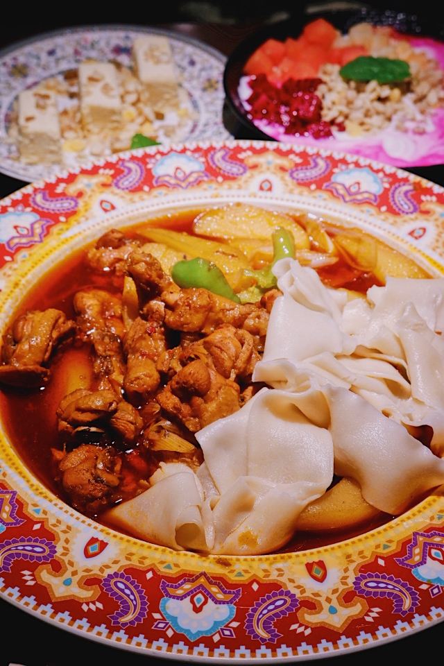 加油干饭呀今年的随心飞算是全面泡汤了,不过身在魔都这座美食天堂,分分钟就可以带上味蕾驰骋到大美边疆。 魔都必吃的新疆餐厅,塔哈尔必须拥有姓名,西域风情的装修非常文艺小清新,就像一张鲜活生动的明信片,金黄灿灿的银杏树叶与彩色玻璃窗格交相辉映,仿佛把时光定格在秋天的童话里。 每桌必点的沙湾大盘鸡,每一块鸡肉都是plus版,肉质紧实鲜嫩不柴,裹满浓郁汤汁鲜辣过瘾,还有堆积成山的酥烂土豆,以及富有嚼劲的手工皮带面,光是这满满一盘就足以吃到扶墙出。 除了雷打不动的大盘鸡和羊肉串,新疆酸汤木棉豆腐一举荣升我的最爱,软fufu的木棉豆腐充分吸收番茄汤汁,每一口都豆香四溢富有嚼劲。 奶茶精实名表白塔哈尔的新疆奶茶,浓醇奶香也太好喝了,可甜可咸但我只忠于原味,喝不完还可以装在瓶子里,让你可以边走边喝哟~