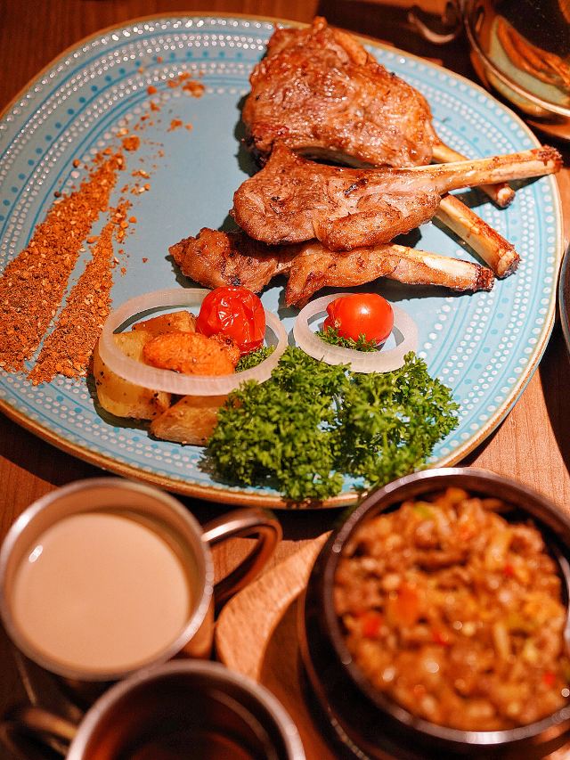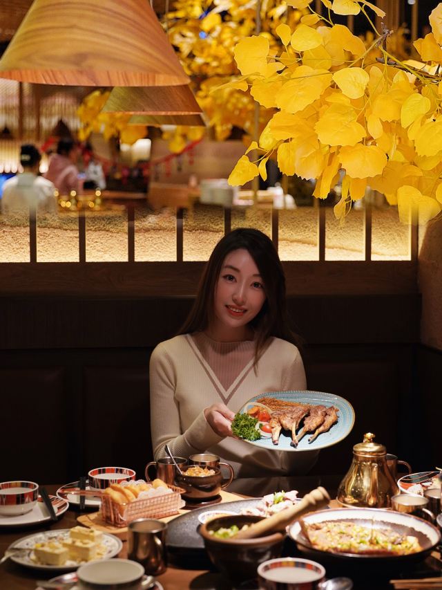 加油干饭呀火爆魔都的宝藏新疆菜,塔哈尔真的称得上是经久不衰,合生汇店复刻了西域的无尽沙漠,仿佛踏上丝绸之路,一睹绚丽旖旎的壮丽风光。 🐟额和烤鱼🐟 塔哈尔可不只有羊肉,还有烟火气十足的烤鱼,看似其貌不扬,却被一口惊艳到!外焦里嫩的烤鱼咸香四溢,表面撒上红椒和蒜苗,层次感很丰富👍 🥩塔式羊排🥩 精心腌制入味的羊排,加入秘制调料烤制成金黄色泽,炭烤焦香融入羊肉脂香,一整个肥瘦相间外酥里嫩,肉香与孜然香气之中还有恰到好处的奶香味,就问你服不服! 🍢烤羊肉串🍢 吃新疆菜可以不点大盘鸡和烤羊排,但羊肉串必须不能少!新疆羊肉串的肉必须大块,一定要烤得羊油冒出来,再撒上满满的孜然,香味瞬间直窜脑门~~~