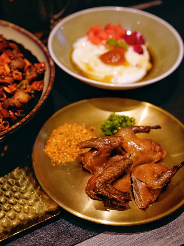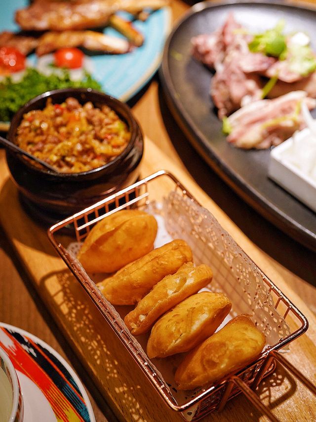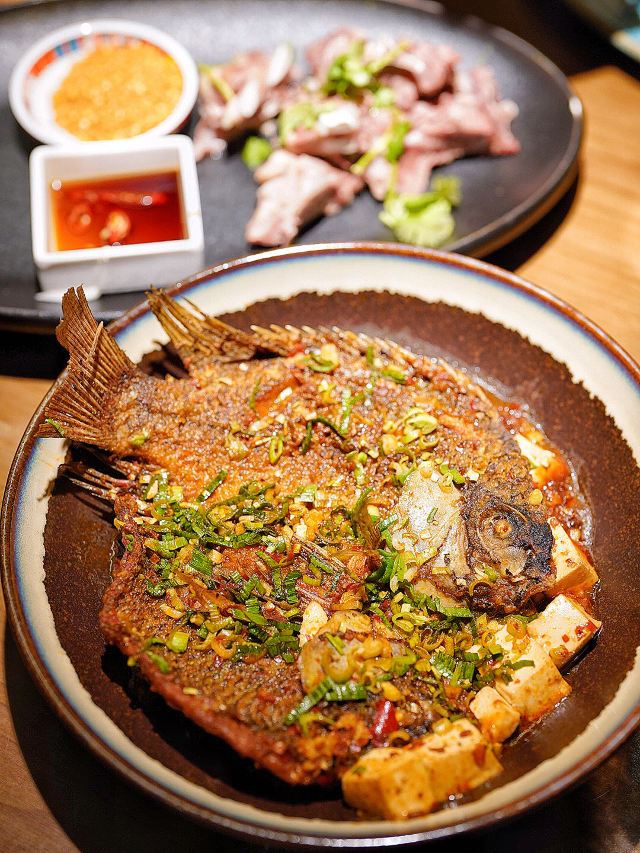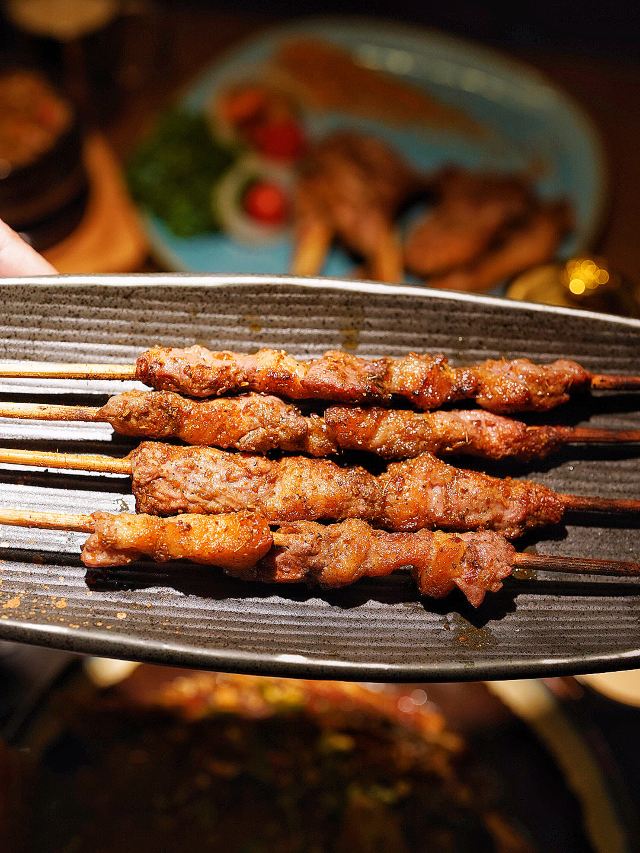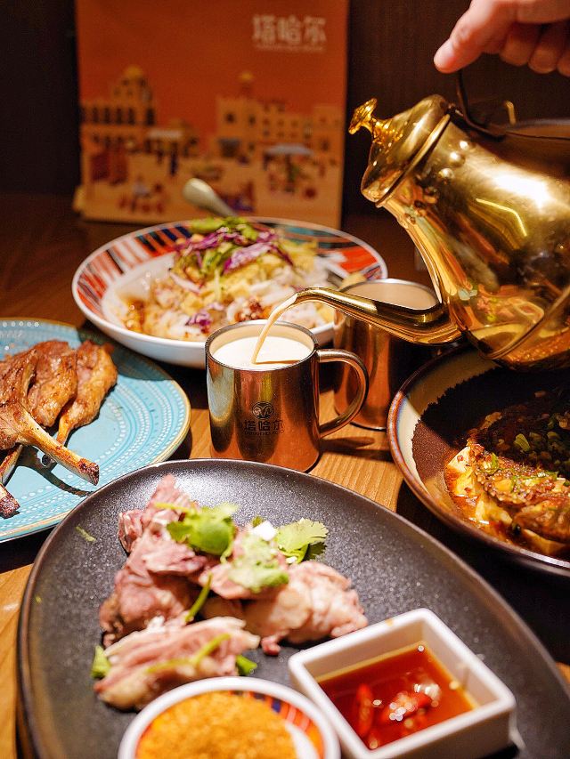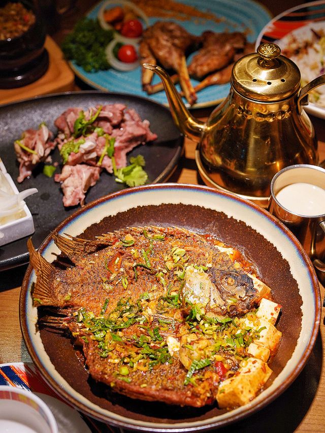 火爆魔都的宝藏新疆菜,塔哈尔真的称得上是经久不衰,合生汇店复刻了西域的无尽沙漠,仿佛踏上丝绸之路,一睹绚丽旖旎的壮丽风光。 🐟额和烤鱼🐟 塔哈尔可不只有羊肉,还有烟火气十足的烤鱼,看似其貌不扬,却被一口惊艳到!外焦里嫩的烤鱼咸香四溢,表面撒上红椒和蒜苗,层次感很丰富👍 🥩塔式羊排🥩 精心腌制入味的羊排,加入秘制调料烤制成金黄色泽,炭烤焦香融入羊肉脂香,一整个肥瘦相间外酥里嫩,肉香与孜然香气之中还有恰到好处的奶香味,就问你服不服! 🍢烤羊肉串🍢 吃新疆菜可以不点大盘鸡和烤羊排,但羊肉串必须不能少!新疆羊肉串的肉必须大块,一定要烤得羊油冒出来,再撒上满满的孜然,香味瞬间直窜脑门~~~