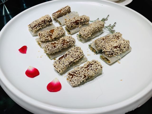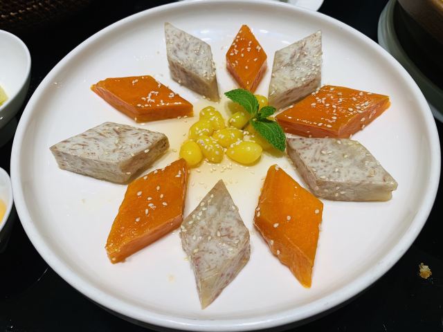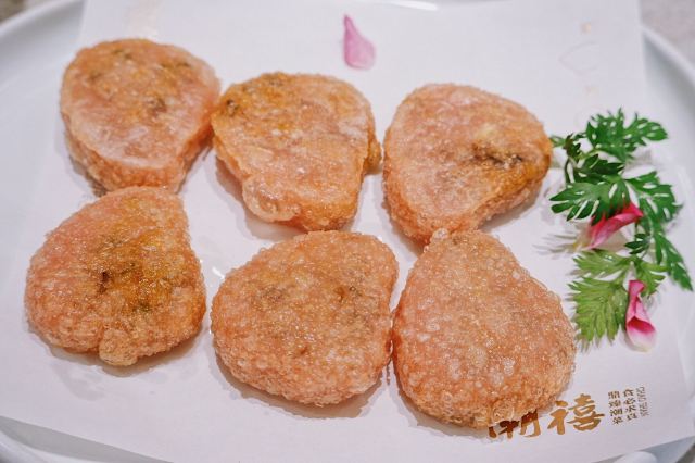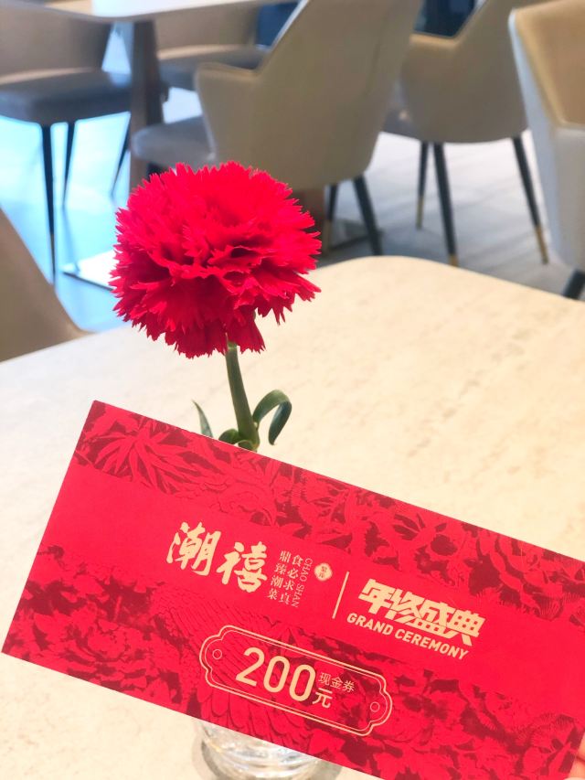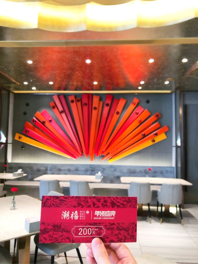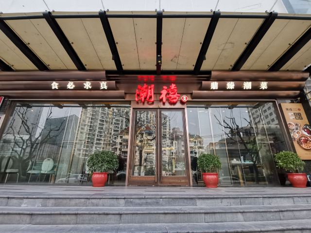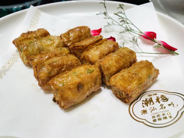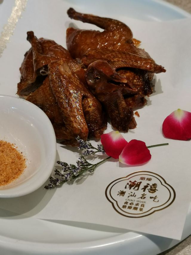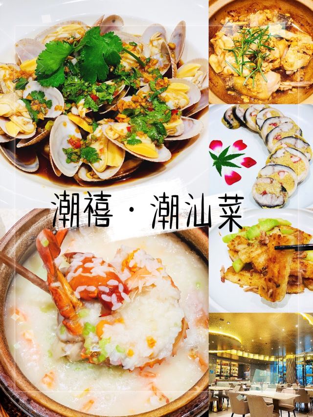 咕噜cloro位于长寿路上沙田大厦一楼新开了一家潮汕菜,名字叫潮禧,大红色的超大字体,还真蛮红红火火,喜气洋洋的~ 一行多人被安排在宽敞舒适的厅堂大圆桌,正厅一处占地蛮大的漆黑色通体消毒柜蛮吸引眼球的,至少让进来的人知道此店安全卫生意识很强!客人随着晚上饭点时间开始增加,熙熙攘攘与轻声细语之间的相结合,整个就餐环境不错~ 冷菜 卤水鹅宝五拼,还没看清有哪五拼呢,眨眼间就老母鸡变鸭,瞬间被同桌的小伙伴们清空了,看来味道是很赞的~ 桂花莲子,薄荷叶点缀,红色枸杞散落其间,香甜中带着淡淡的桂花香气~ 潮州炒麻叶,据店家经理介绍是潮州当地的一款野菜,味道还蛮好吃的,菜品中的一抹小清新~ 自制咸菜口,原谅我好这一口,大大的菜瓣,看到就有口水分泌旺盛,空口吃了好几瓣,此时有碗白粥,就着这自制咸菜,我感觉我能吃上好几碗白粥配咸菜[笑哭][笑哭]我承认我就这点追求了[笑脸] 越式时蔬佐松板肉,越式时蔬是用越南米纸包裹蔬菜铺在裹满白芝麻的松板肉的下面,吃的时候一起吃,松板肉的精致紧实入口有嚼劲加上越式时蔬的清爽,是一道值得推荐的菜品~ 潮州红肉米,看着像一款拌菜,吃起来有点像我们平时吃的海瓜子[偷笑] 热菜 潮式浸油蛤,感觉只只尺寸大小都差不多,趁热吃,一口一个,一下能吃好几个~ 潮州炸果肉,这道菜不陌生的,在其他的潮州菜馆中也有吃到过,就是喜欢这种油炸的小品,小小一块,2口一个,在口腔中慢慢回味的美好~ 潮州煎蚝仔烙,感觉就是豪华版的台湾蚵仔煎[愉快] 脆皮肥牛,做功考究,菜如其名,外皮酥脆,肥牛香嫩,好好次[调皮] 骨香多宝鱼,是将多宝鱼直接骨肉分离,鱼肉切适中条状,入口调味适中,连小鱼刺都没有,适合老人小孩食用~ 潮式花胶鸡煲,超大一份,是适合10人份的量,原汁原味的浓郁花胶鸡汤,鲜美无比,除了花胶,鸡,还有好多鲜贝瑶柱在里面,一碗值得打CALL美味鸡汤~ 家乡焖白茄,是为上面辣么的荤菜解腻的一道素菜~ 猪油渣炒广东菜心,另一道碧绿生青的蔬菜~ 配上浓稠的石锅鱼粥,正正好好,里面鱼肉鱼片好料不少喔~ 最后以一道小点结尾,糕烧双色,分别是南瓜与芋艿,听说写芋艿还是从潮汕特地空运过来的,与我们上海本地的芋艿不一样喔~ 以上~