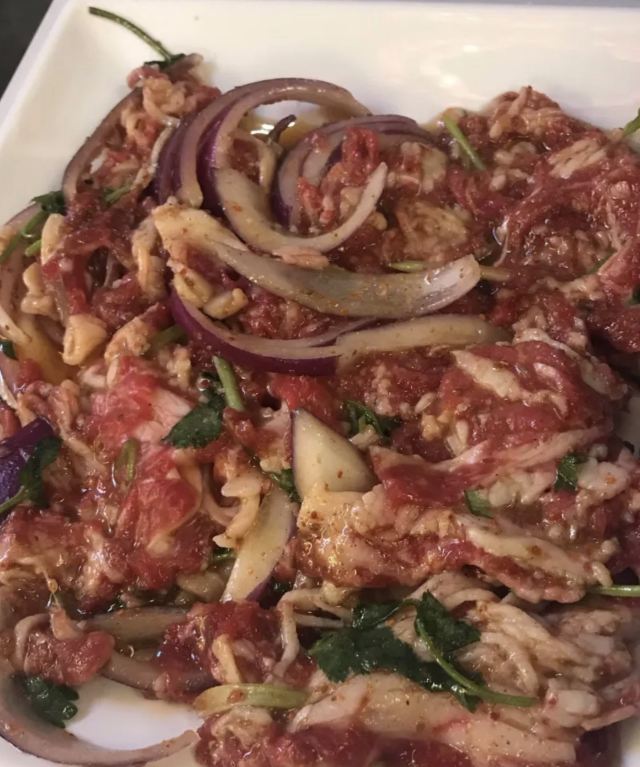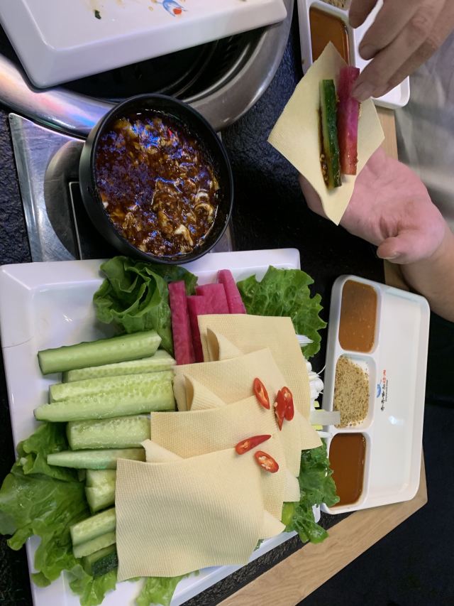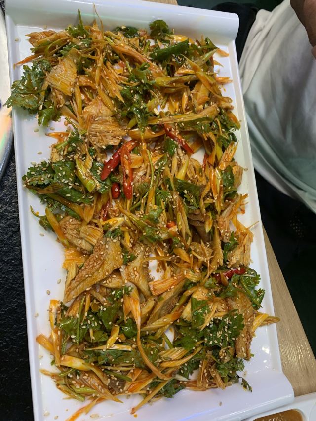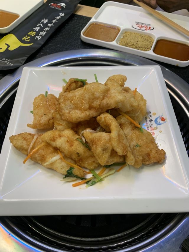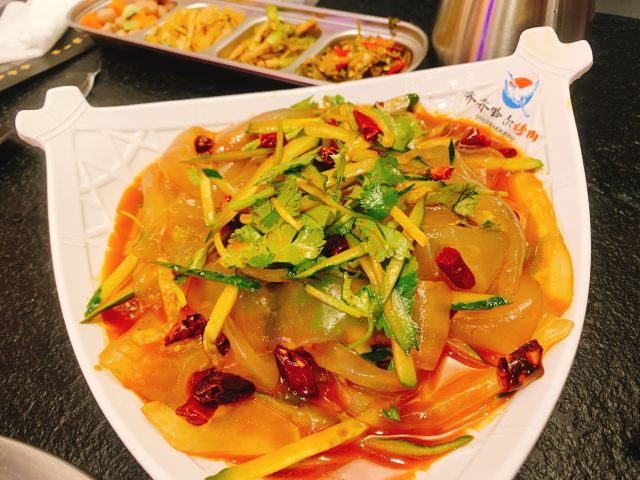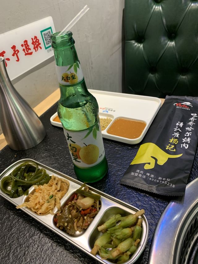 Yangjiqiqiha'er Barbecue (yangpu)这家东北烤肉依然味道不错,大部分四人桌,我们就过道上加位子吧。 「大白梨」甜甜咸咸香精味重不大吃的惯呢。 「锅包肉」虽然跟在东北吃到的不能比,在上海我的行动范围内算很好吃了。 「蘸酱菜」每次必点,这次豆皮更老,鸡蛋酱没花心思炒,稀拉拉一层油。蔬菜鲜嫩强 【烤肉】口味真心不错,最爱招牌牛肉。大片牛肉和牛舌很香嫩。牛肉粒嚼嚼更香。牛肠相当肥美。反正菜没地方搁,肉到了就倒篦子上直接烤。管他啥肉,好吃就好。另外点了个什么“卤牛肉”?上桌的是一盘辣油拌香菜大葱堆里找牛杂牛肉牛板筋的菜。不爱香菜和大葱的小伙伴避雷。