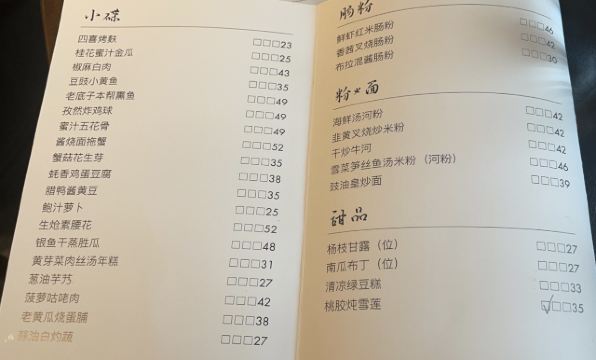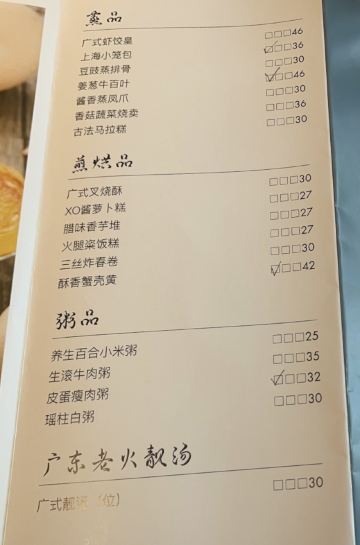 XO花枝玉带,广式清蒸老虎斑,小米金汤扣八头鲍鱼,餐后水果,干巴菌刀板香石锅菜饭,黑松露和牛肋肉,XO姜炒带子兰花蚌,蟹粉烧麦皇,糖藕,醉虾,豆浆冰淇淋配自制绿豆糕,七十年代熏鱼,鲍汁萝卜,腐乳鹅肝佐葱油饼,糟骨头农家肉饼蒸三门蟹,杨枝甘露伴椰子冰激凌,春蛋红烧肉,蟹粉松茸烩鱼珠,脆皮石岐双乳鸽,桂花糖藕,芝士海鲜焗小青龙,响油鳝糊,松鼠桂鱼