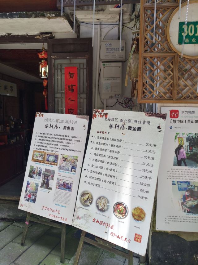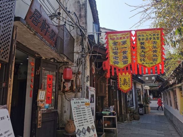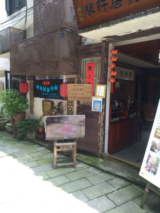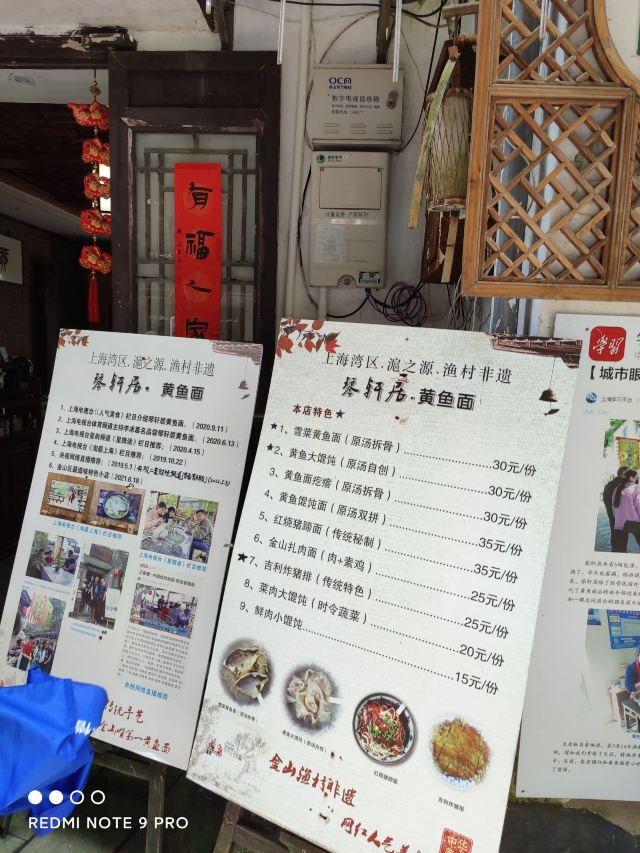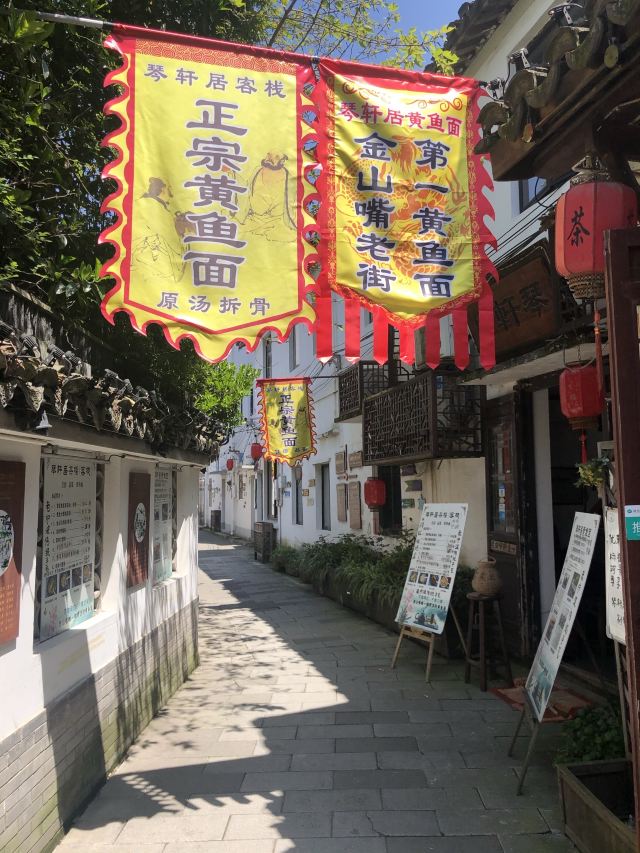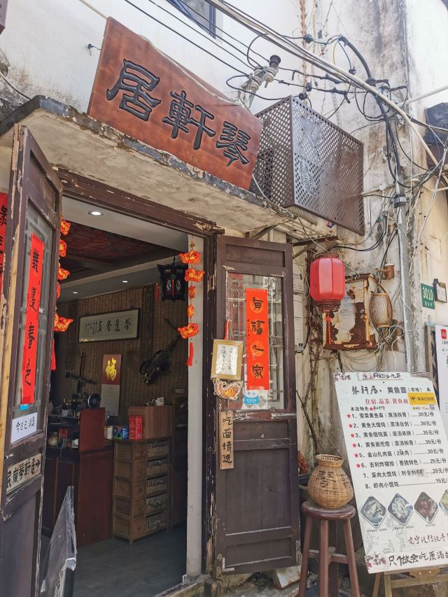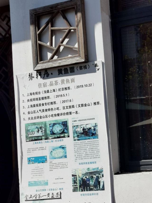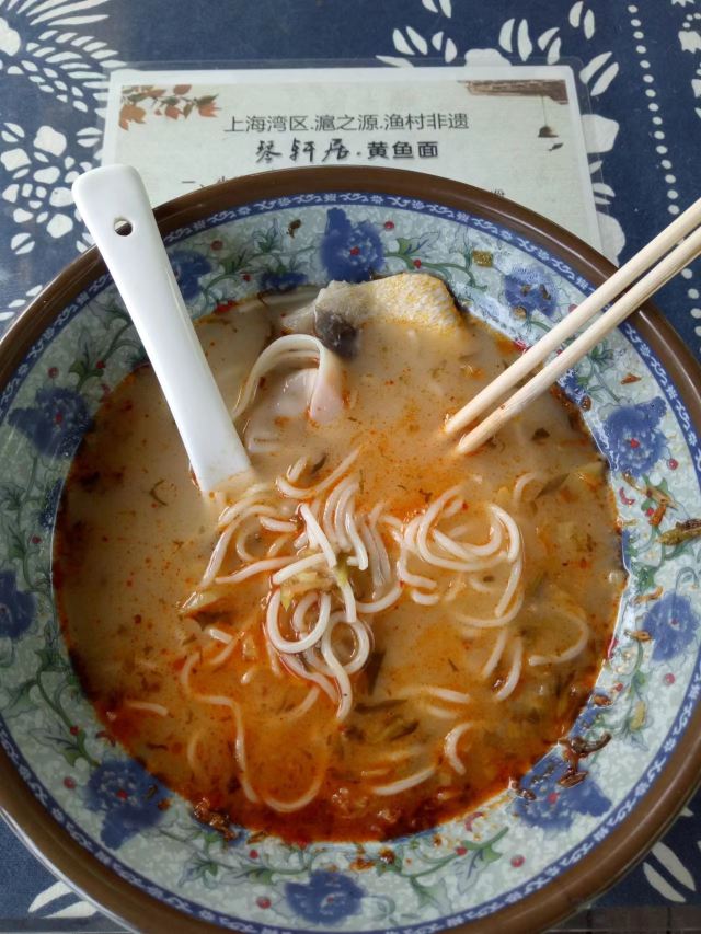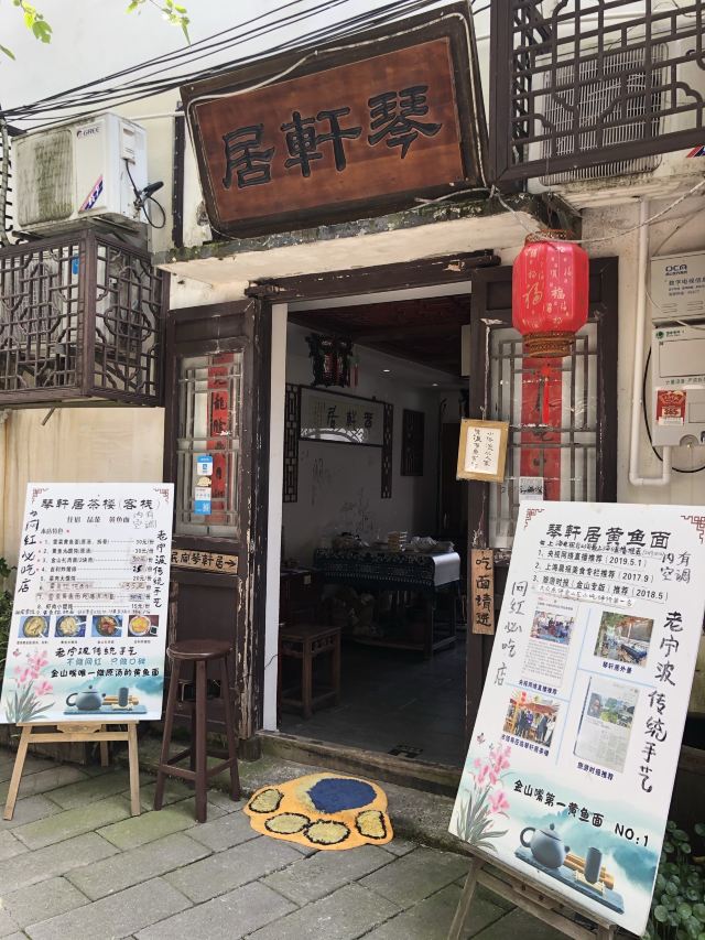 Qin Xuan Ju ·Yellow Croaker Noodles🎻琴轩居,位于金山嘴渔村内,进门就是一个蛮大的庭院,种了很多花花草草,摆放了大大小小的桌椅,冬天可以一边晒太阳一边喝茶,夏天可以晚上边乘凉边吃饭喝茶,环境还不错。 🍜这家店的黄鱼面,在金山嘴渔村小有名气,上过央视节目,门口的大电视机天天滚动播出。慕名而去,点了一碗黄鱼馄饨。吃下来味道一般,下次还是开吃有名的黄鱼面吧……